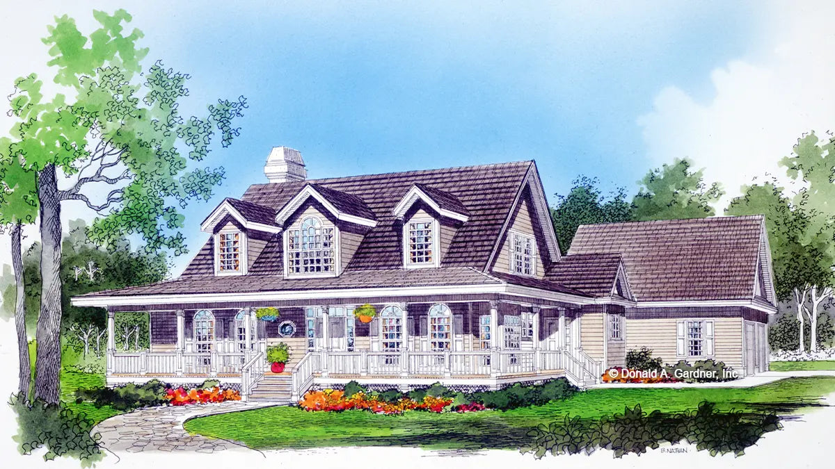 A genteel southern influence is evident in the wraparound porch and graceful arched windows of this light-filled, four bedroom farmhouse. A gathering space of grand scale includes great room, breakfast area, and island kitchen with dining counter, pantry, and built-in desk for the busy chef. The two-story foyer with Palladian window and formal dining room with bay lend a formal air. The master suite impresses with cathedral ceiling, skylit whirlpool tub, and separate shower. A skylit bonus room is located over the garage.