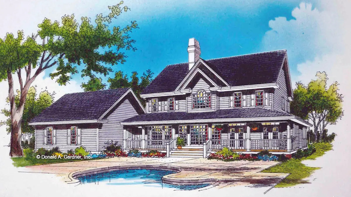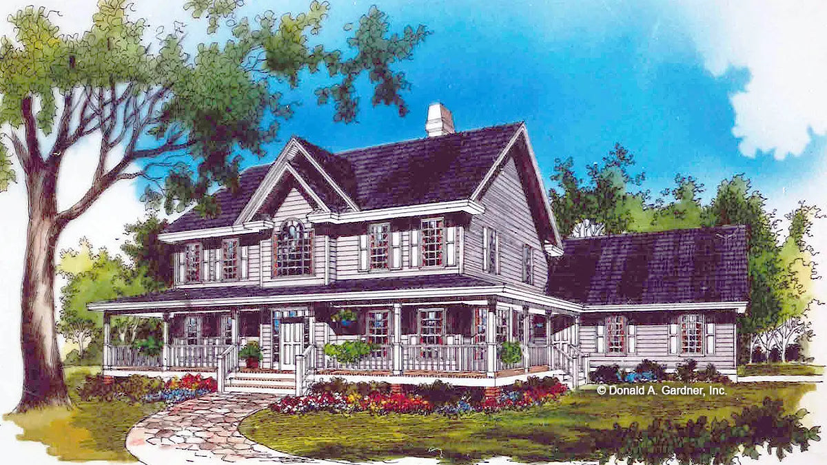 With its long wrap-around porches and expansive informal living spaces stretching across the back, this farmhouse projects a graceful, relaxed attitude. Nine-foot ceilings on the first level with a vaulted ceiling in the great room, ventilating skylights in the sunroom, a two-level foyer, and bay windows combine to make this home feel more like 3,000 square feet. The first level bedroom can double as a study, while the master bedroom upstairs features doubles vanities and a large walk-in closet.