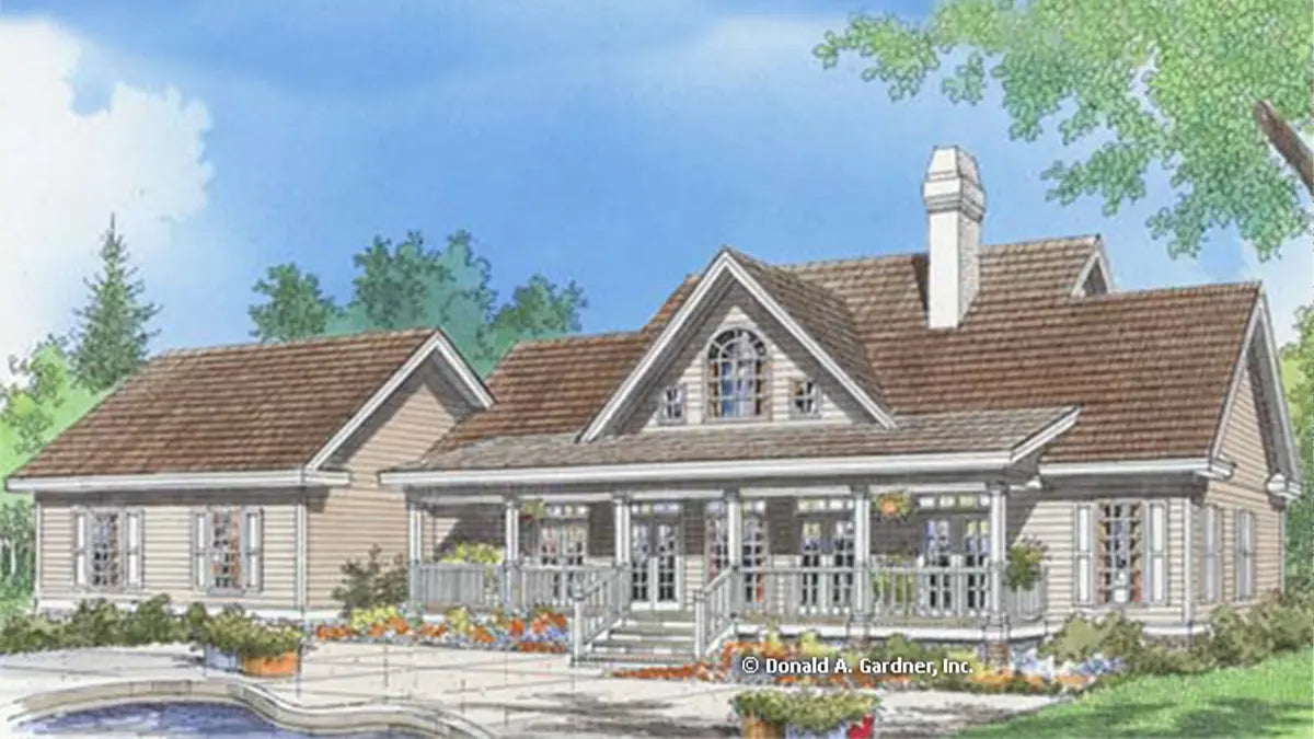 A dynamic layout uses interior columns to create expansive rooms in this elegant dormered four-bedroom country home. The great room with cathedral ceiling, built-in bookshelves, and balcony opens to a rear porch for relaxed entertaining. The master bedroom with luxurious bath is downstairs for privacy, and a front bedroom doubles as a study. Storage space includes a large walk-in pantry and easy attic access.