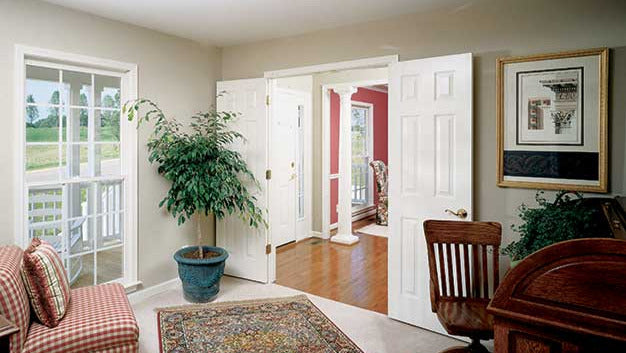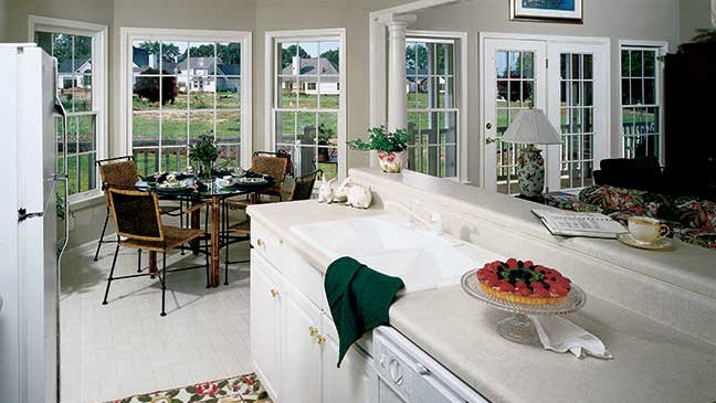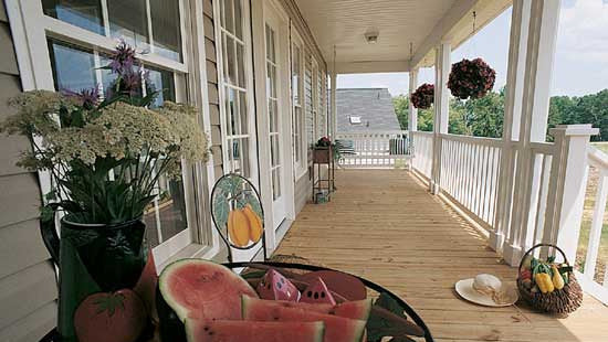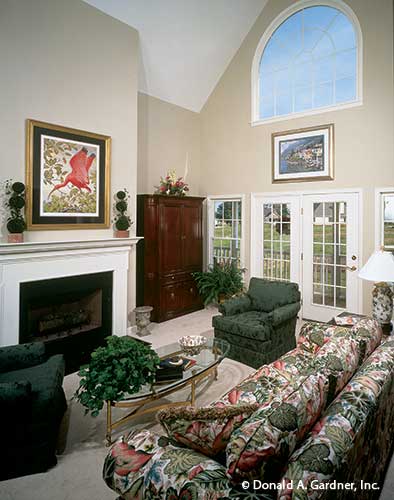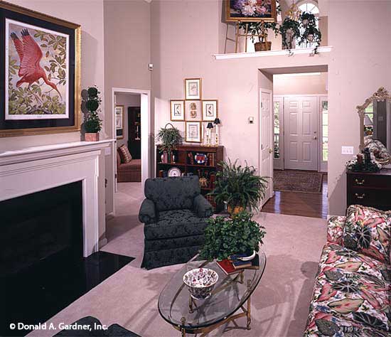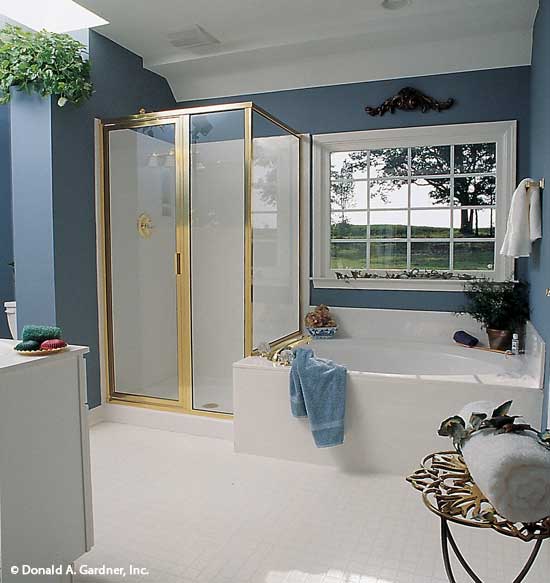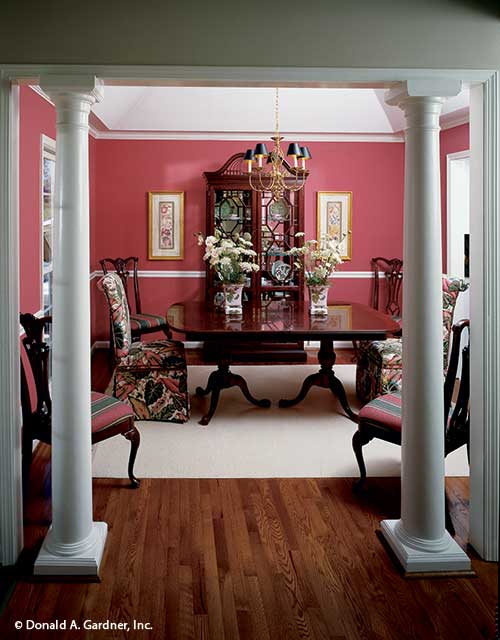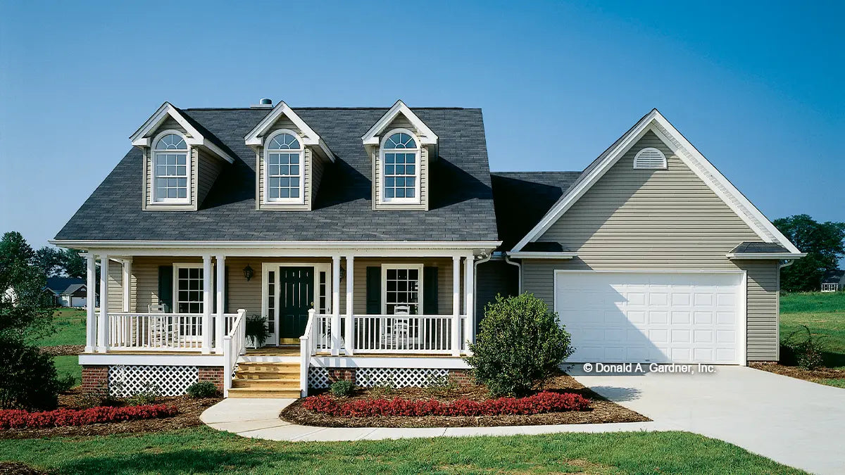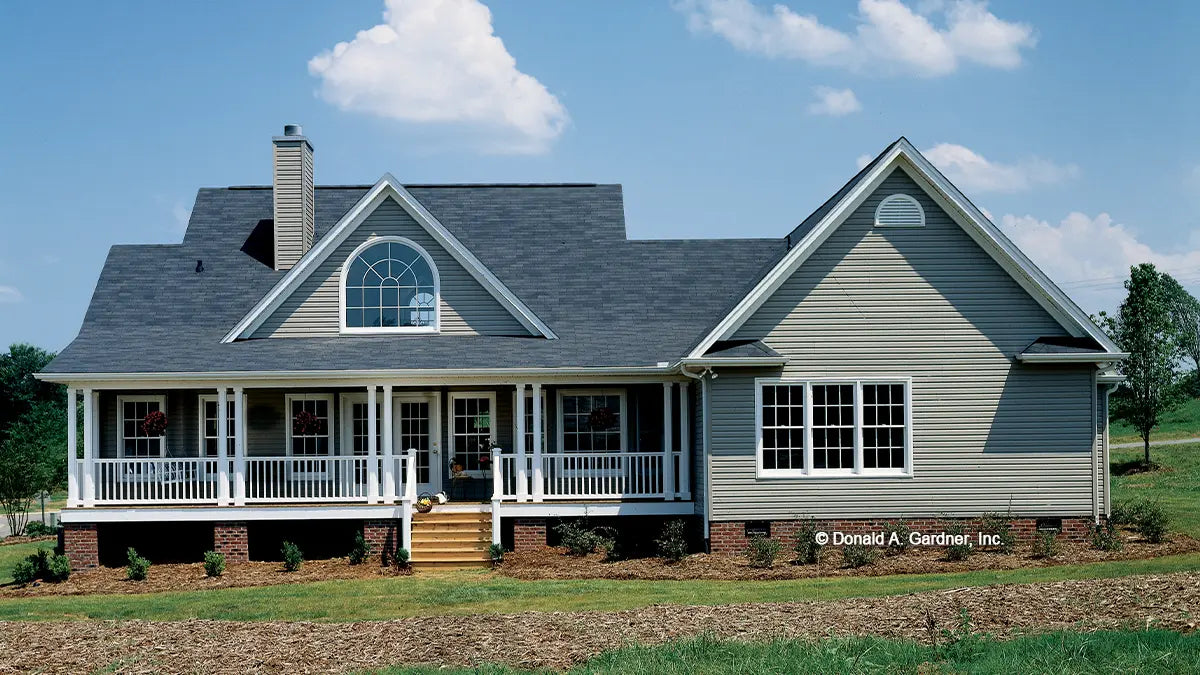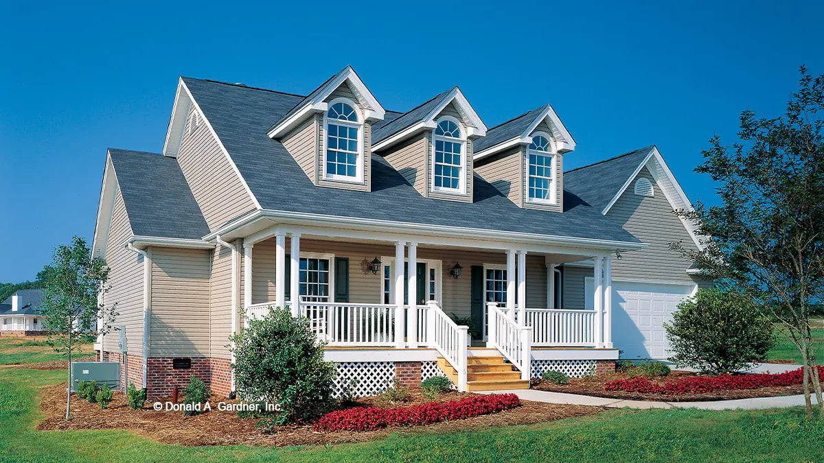 This country home plan is as beautiful from the back as it is from the front. Porches front and back, gables, and dormers provide special charm. The central great room has a cathedral ceiling, fireplace, and a clerestory window, which brings in lots of natural light. Columns divide the open great room from the kitchen and breakfast bay. A tray ceiling and columns dress up the formal dining room. The master suite with tray ceiling and back porch access is privately located in the rear. The skylit master bath features whirlpool tub, shower, double vanity, and spacious walk-in closet. The front bedroom with walk-in closet doubles as a study. A garage with ample storage completes the home plan.