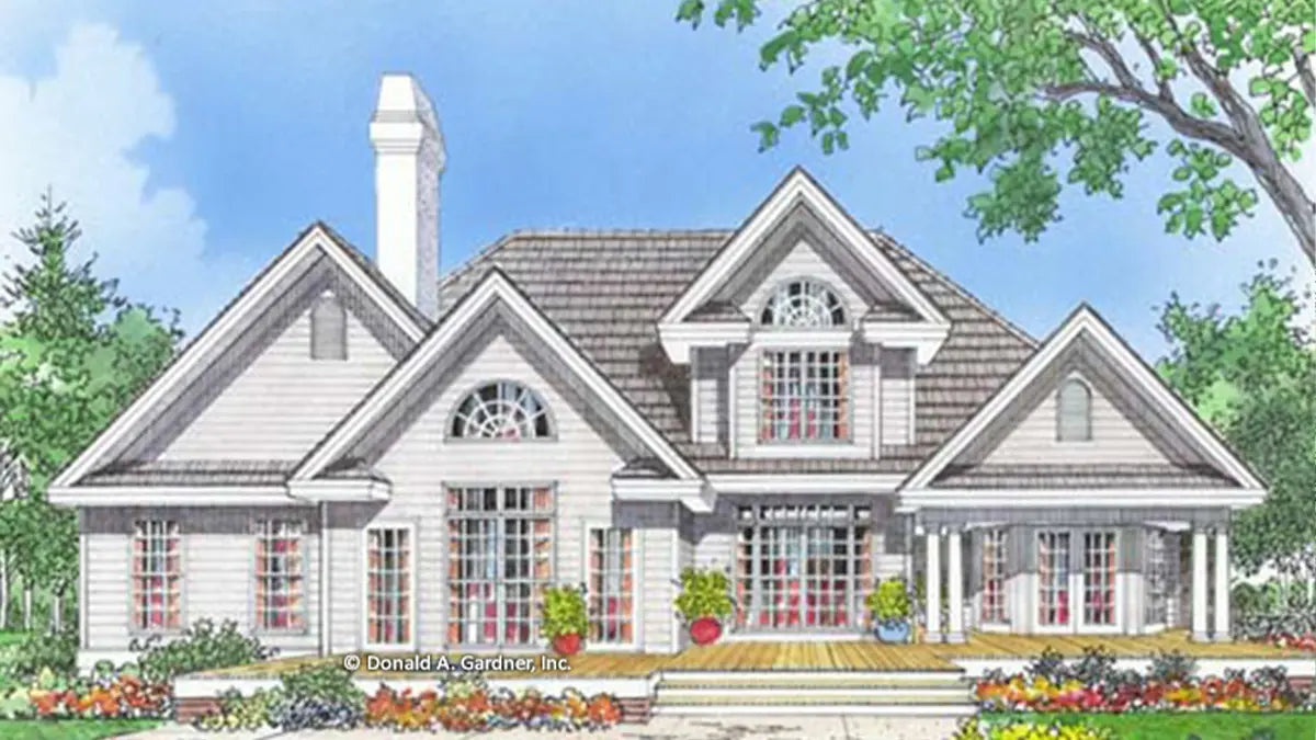 This expansive family home plan features an open, flowing floor plan and looks good from both the front and rear. Enter the welcoming foyer and continue to the versatile bedroom/ study, the formal living room expanded by a tray ceiling, or up to the second-floor balcony that overlooks the great room. Or, proceed through the colonnaded great room and linger on the relaxing deck. Downstairs, the secluded master suite features a tray ceiling in the bedroom for volume and interest. A garden tub with a picture window is the focal point of the master bath while a spacious walk-in closet finishes the retreat. Upstairs, two bedrooms, highlighted by cathedral ceilings, share a full bath. Storage abounds in the attic and skylit bonus room.