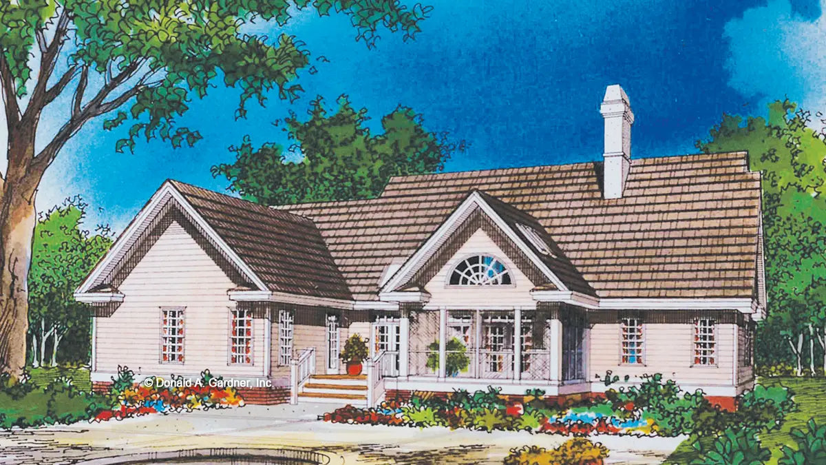 A dormer, gables, and brick accents add elegance to a relaxed and flexible plan with room to grow. A cathedral ceiling enlarges the great room and expands the skylit screened porch. The dining room and front bedroom/study feature tray ceilings and circle-top picture windows for extra light and space. Parents will enjoy their private suite, highlighted by a bright, skylit bath with garden tub and double bowl vanity. Additional bedrooms, located on the opposite side of the house, share a full bath and large linen closet. The spacious second floor bonus space can be finished in a variety of ways to satisfy a growing family.