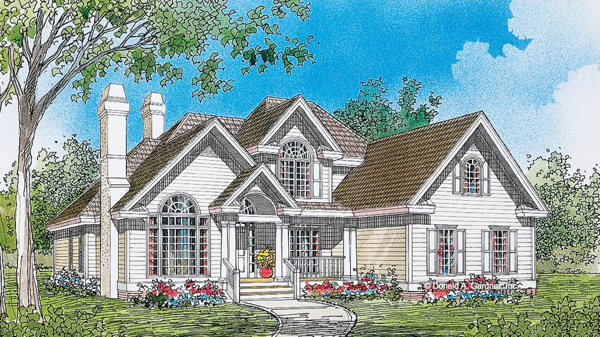 A barrel-vaulted entry invites visitors into this gracious and comfortable four-bedroom home. The foyer, illuminated by the elegant, arched entry, has direct access to the master retreat. The private master bath includes a separate shower, skylit garden tub, and enclosed toilet. A tray ceiling and a fireplace highlight the versatile living room/study, while a cathedral ceiling opens up the family room with rear deck access. Upstairs, the front bedroom features a walk-in closet and cathedral ceiling that highlights a double window with half-round. A skylit bonus room rounds out the plan.