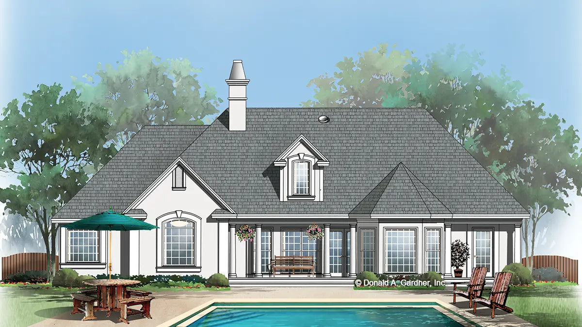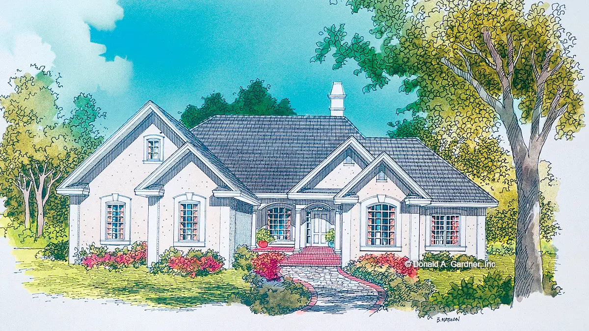 Keystone arches, gables, and stucco give European sophistication to this great plan, designed for the comfort of today's American family.