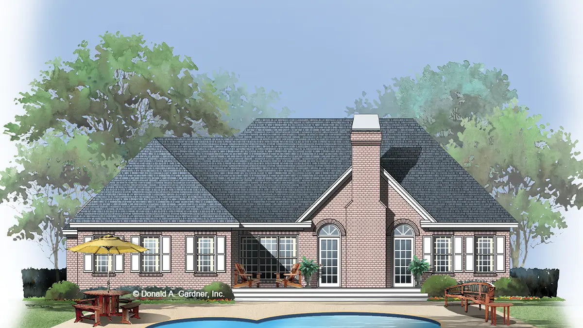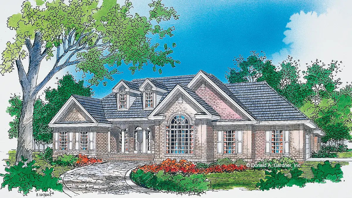 Without compromising any of the unique Gardner-style features, we've created a beautiful family home designed for easy building and easy living. The refined, traditional exterior stops traffic with eye-catching brick, double dormers, and a hip roof. Inside, the foyer opens to a generous great room with cathedral ceiling and fireplace. Columns define the entrance to the kitchen, while the entrance to the master suite is secluded beyond the breakfast area. The master bedroom, dining room, and front bedroom/study receive distinction from tray ceilings. Two family bedrooms share a full bath with dual vanities.