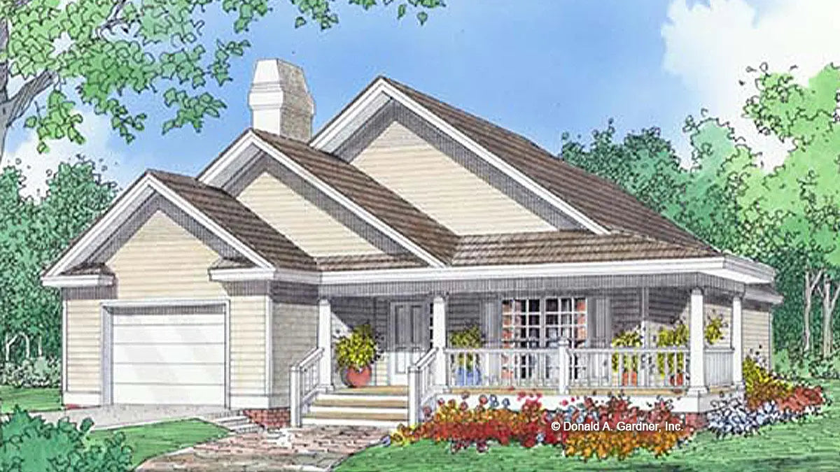 A cozy porch encases this economical bungalow in country luxury. The formal foyer introduces a central great room with cathedral ceiling and fireplace and opens to the dining room. The efficient, U-shaped kitchen with utility space and nearby pantry features a convenient pass thru to the dining room and access to the rear deck. The front bedroom, with walk-in closet and adjacent full bath, doubles as a study, while the master suite has its own private bath with double bowl vanity and both walk-in and linen closets.