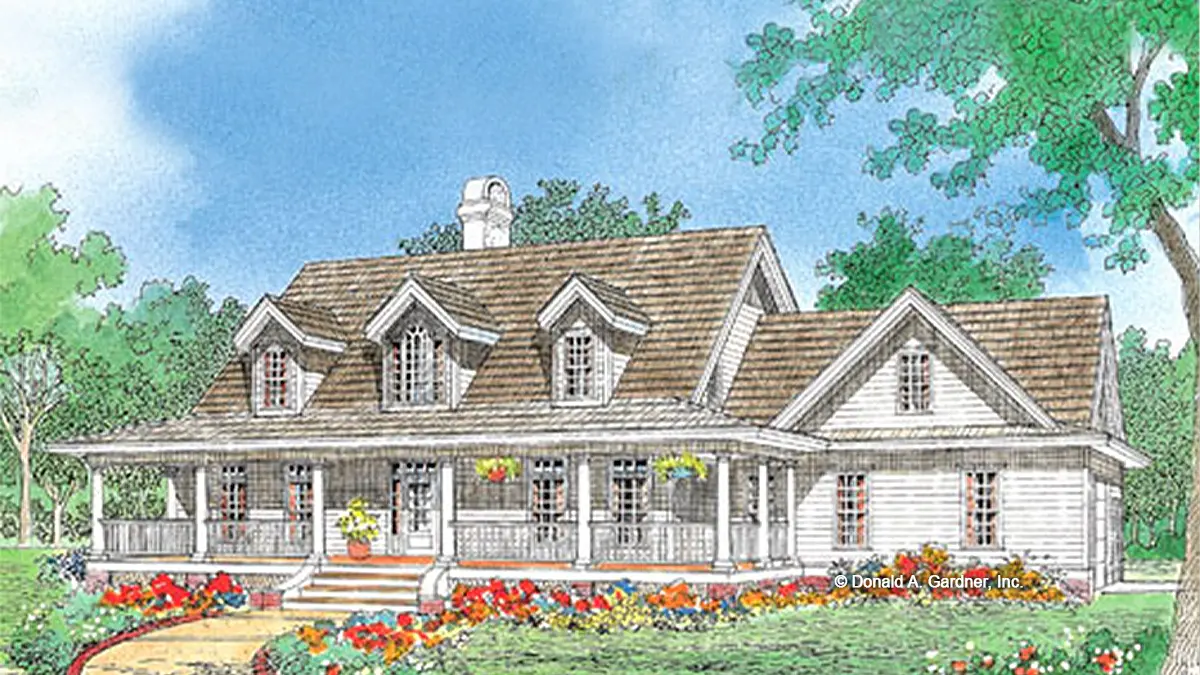 This country farmhouse charms with its wrapping front porch and gabled dormers. The foyer gives way to a generous great room with fireplace, cathedral ceiling, and balcony above. Nearby, a flexible bedroom/study has a walk-in closet and adjacent full bath. The first-floor master suite with sunny bay window features a private bath with cathedral ceiling, his and her vanities, and a separate tub and shower. Two more bedrooms, each with dormer windows, are located upstairs and share a bath with cathedral ceiling, palladian window, and double bowl vanity. A bonus room over the garage completes the plan.