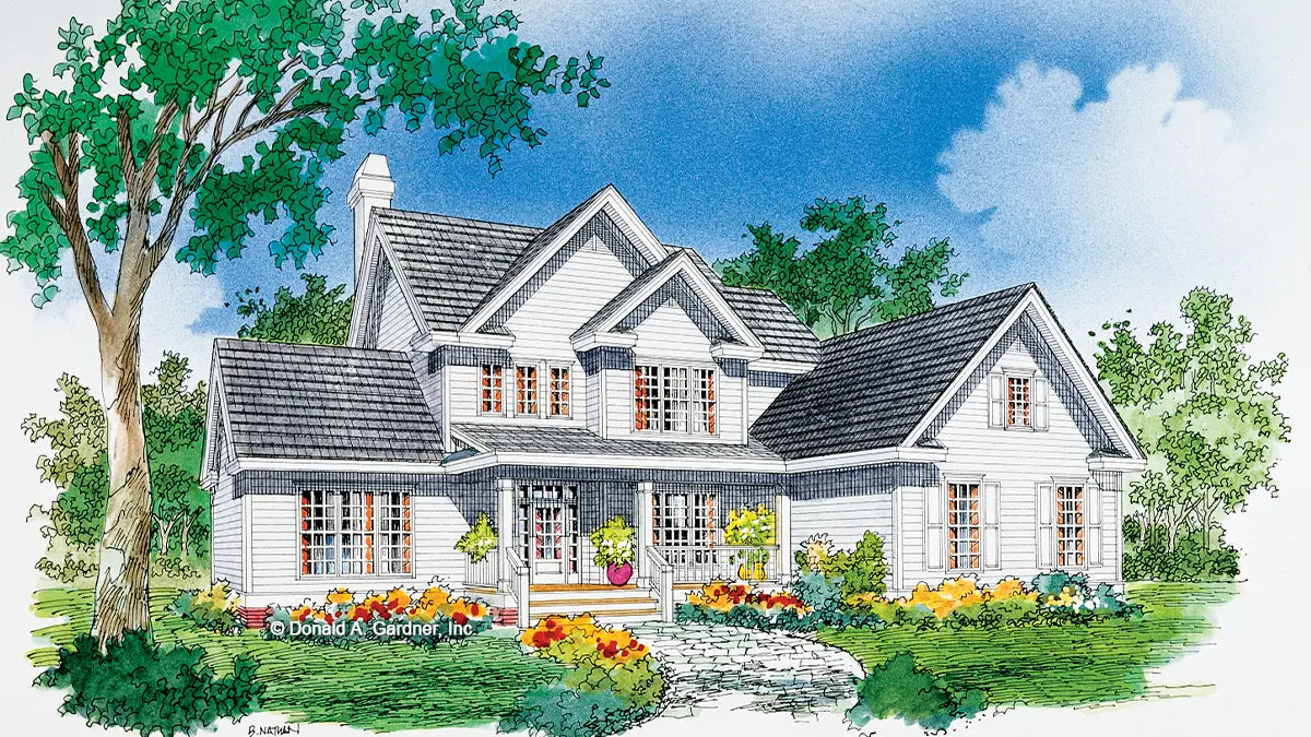 A smart exterior and an economical use of interior space combine to create this roomy, yet practical family home plan. The two-story foyer leads to a two-story great room with fireplace, a wall of windows, and access to the back porch. Columns divide the great room from breakfast room, which is open to an angled kitchen with pantry. A handy utility room leads to a two-car garage with ample storage space. A split bedroom plan places the master suite, with two walk-in closets, on the first floor and two additional bedrooms, a full bath, and skylit bonus room on the second floor.