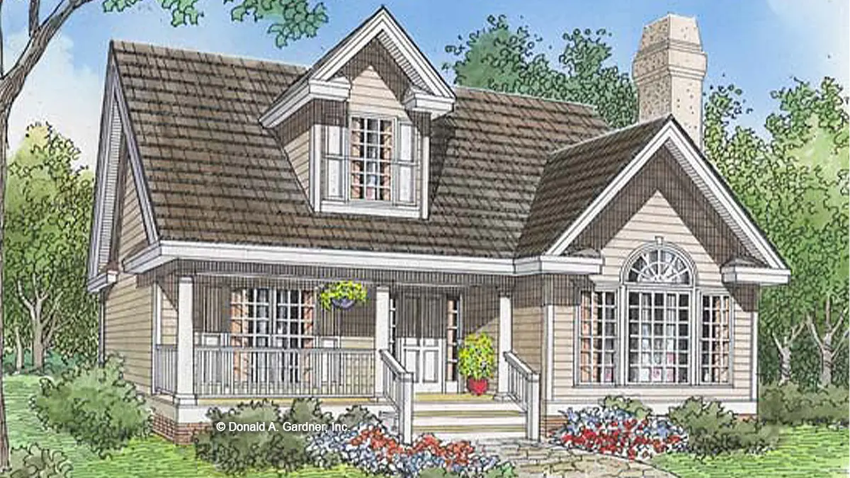 A splendid palladian window, a gabled dormer, and a cozy front porch provide ample curb appeal for this lovely small home. Well-suited for narrow lots, this plan features a rear entry garage and all-over slim design. The vaulted great room is highlighted by an impressive palladian window and is separated from the dining room with bay by two interior columns. The U-shaped kitchen is adjacent to the breakfast room with side deck access. Two bedrooms on the first floor share a full bath, while upstairs, the master suite features a dormer, his and her closets, and a private bath.
