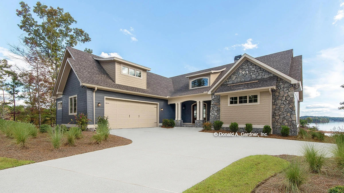 The exterior of this hillside walkout home plan is rich with detail, from the stone arches to the sloped shed dormer over the garage. A beamed cathedral ceiling tops the living area from the island kitchen to the cozy fireplace with built-in cabinetry. The bedroom/study displays a coffered ceiling and has its own private bath, while the master bedroom enjoys a cozy fireplace and porch access in this home plan. The lower level is perfect for guests with two bedrooms, bathrooms, and a spacious rec room with fireplace and wet bar.