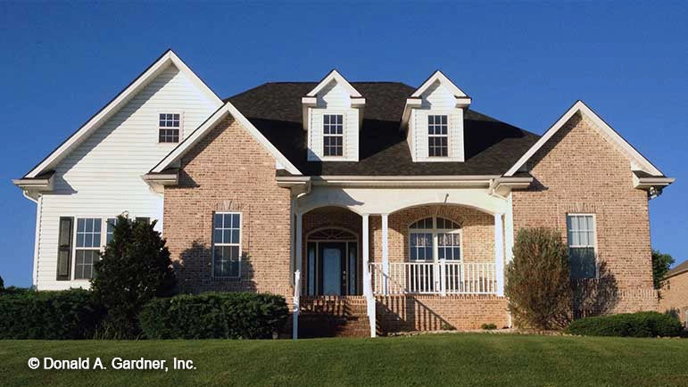 Columns and arches frame the front porch and echo the arched window transoms on this three-bedroom home.