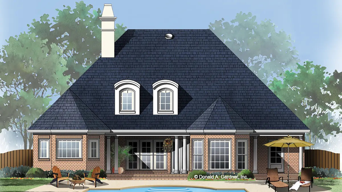 A grand hip roof and four front facing gables, a dual columned entry with transoms, and graceful keystone arches create a dignified facade for this brick traditional with a floor plan designed for accessibility. The single front dormer lights the foyer, while two rear dormers bring plenty of light into the great room. A cathedral ceiling adds space to the open great room which features built-in bookshelves on either side of the fireplace. The master suite, with tray ceiling, pampers homeowners with his and her walk-in closets and a spectacular bayed bath with garden tub, separate shower, dual vanities, and enclosed toilet.