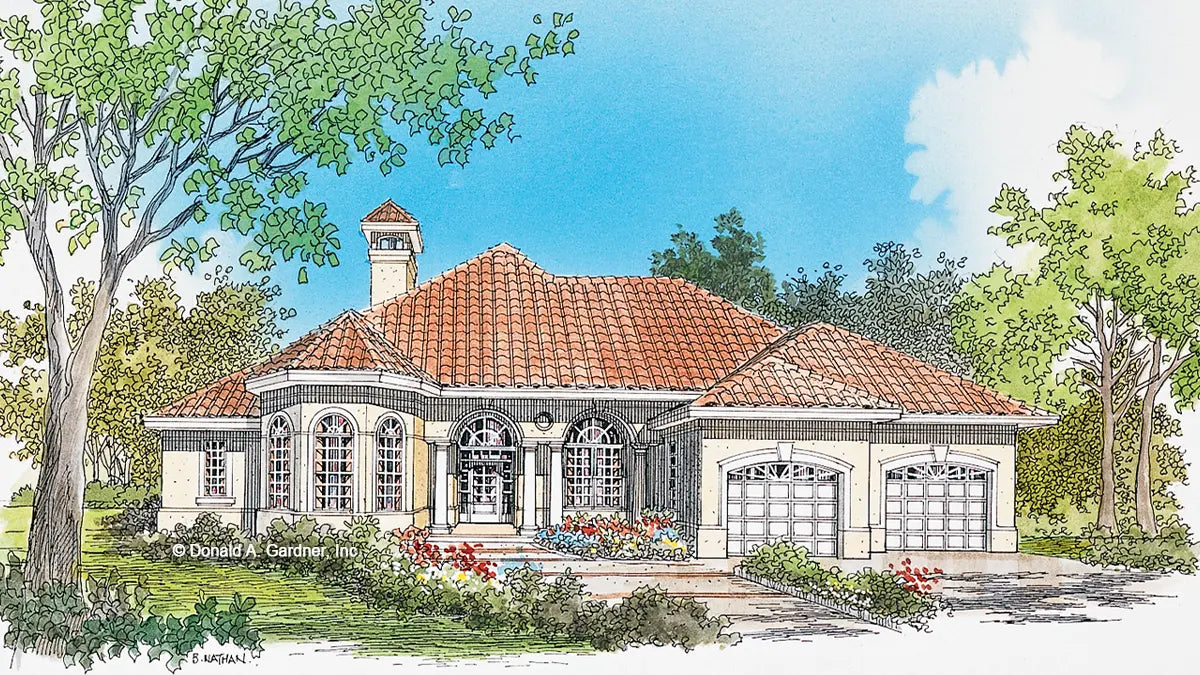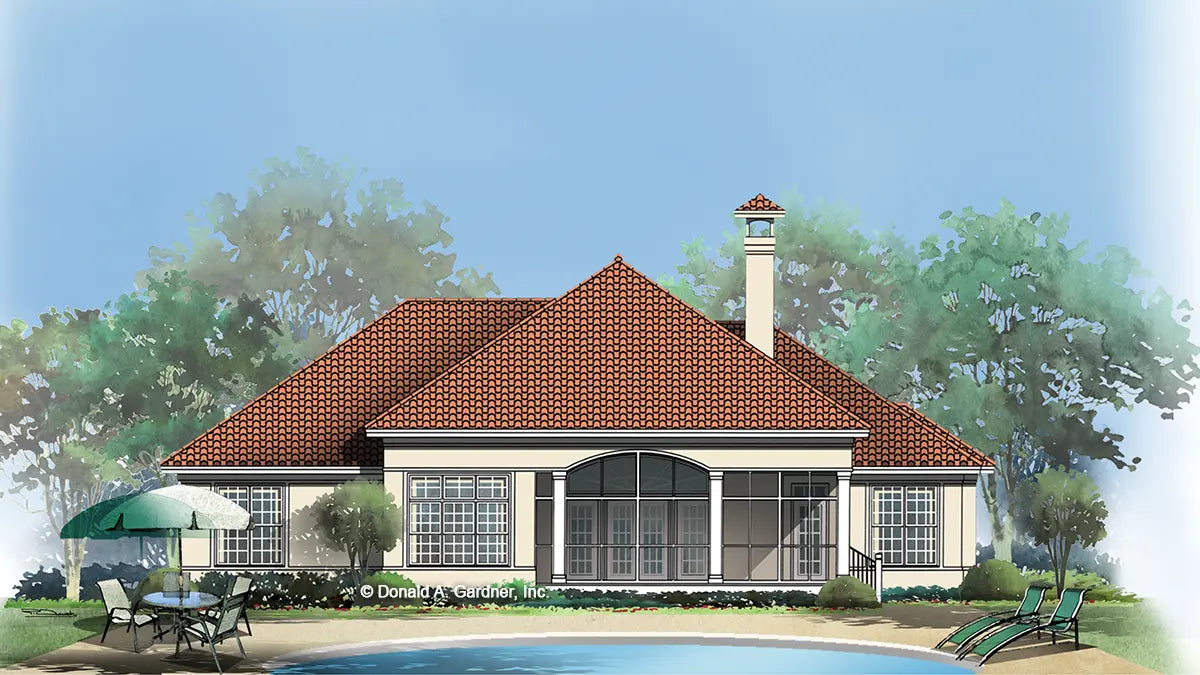 Large windows with circle tops, a stucco veneer and tile roof, and an open, easy living floor plan combine to create this stunning four-bedroom Mediterranean-inspired house plan. Impressive twelve-foot ceilings grace the central common areas of the house plan as well as the inviting screened back porch. The kitchen, partially enclosed by eight-foot-high walls, features a useful pass-thru to the great room, keeping the family cook in the conversation. A versatile study/bedroom is adjacent to a powder room with an alternate full bath option. The master bedroom, with elegant tray ceiling, has access to the screened porch, and its private bath features a garden tub, separate shower, and dual sink vanity with knee space. Two additional bedrooms are located on the opposite side of the house plan.