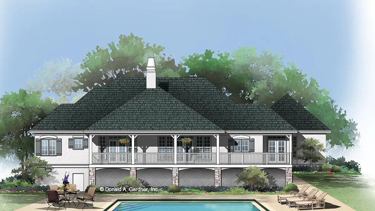A lovely European courtyard introduces this stone and stucco stunner, while a generous back porch and deck take advantage of rear views. The dining room boasts an eleven-foot ceiling and a dramatic curved wall of windows with clerestories. Columns mark boundaries for the dining room as well as the great room where a cathedral ceiling adds spaciousness. The center island kitchen features a handy pass-thru to the great room, and the breakfast room is bright and sunny with its numerous windows. The pampering master suite features double door entry, a tray ceiling, back porch access, dual walk-in closets, and a private bath. Two family bedrooms and a full bath are located down a short hall.