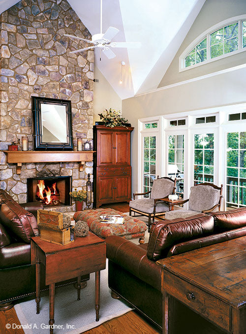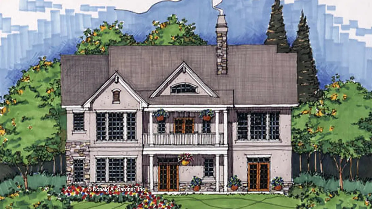 Designed for sloping lots, this stone and stucco home takes advantage of rear views, making it a great lakeside or mountain retreat. The floor plan features a very open design with cathedral ceilings in the great room and master bedroom and a tray ceiling in the dining room. A wet bar is conveniently situated between the kitchen and great room, and both dining room and great room access the back porch. The master suite maintains privacy on the first floor, and walk-in closets and a well-appointed bath enhance its luxury. Downstairs, two more bedrooms share an adjoining bath, and the enormous media/rec room offers an endless list of options.