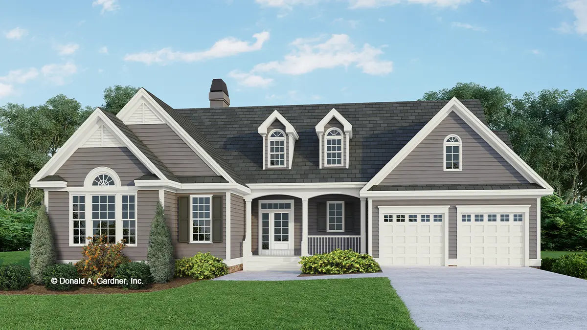 Multiple gables and double dormers adorn the facade of this modest three bedroom country home. Inside, even more custom style details, unexpected in a home of this size, embellish the design: cathedral ceilings, built-in shelving, ample closet and storage space, and a sizable bonus room. The great room, dining room, and kitchen are all open to one another under a shared cathedral ceiling. Up front, two bedrooms share a hall bath, while the master suite, located at the rear of the home, features a private bath, walk-in closet, and access to the back porch.