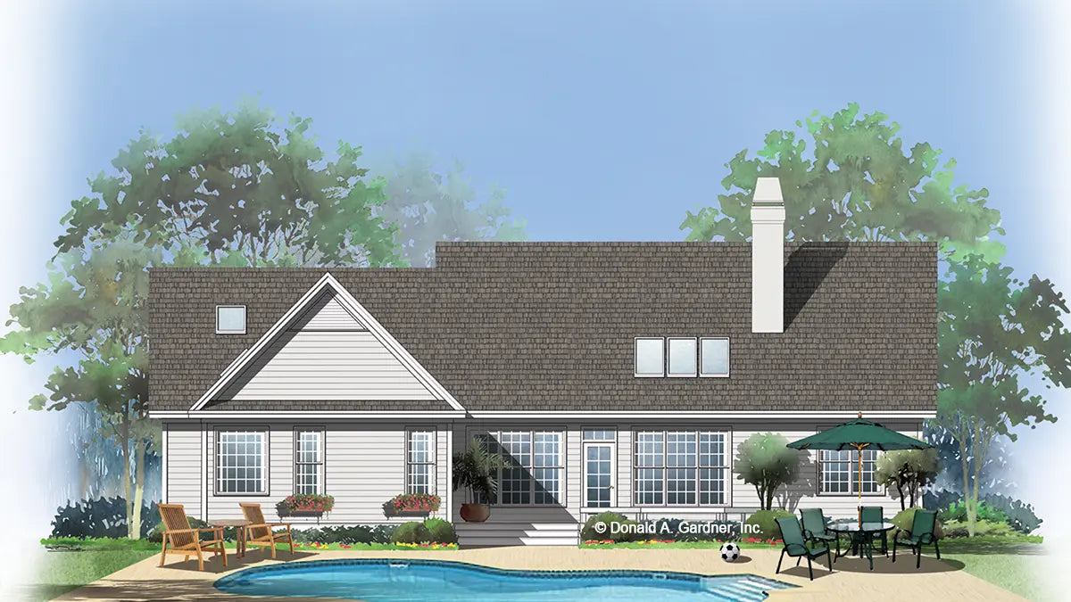 Three bold gables, arched windows, and a duo of twin columns frame entry to this economical, three-bedroom home. Once inside, open is the key word here. Foyer, great room, dining room, and kitchen flow easily from room to room with scarcely a wall between them. Vaulted and cathedral ceilings add volume throughout the home's principal rooms, while skylights illuminate the great room and master bath. Conveniently located near the laundry and access to the large rear deck, the vaulted master suite is positioned for privacy at the rear of the home with a roomy bath and walk-in closet. Two additional bedrooms on the opposite side of the house share a hall bath with linen closet.