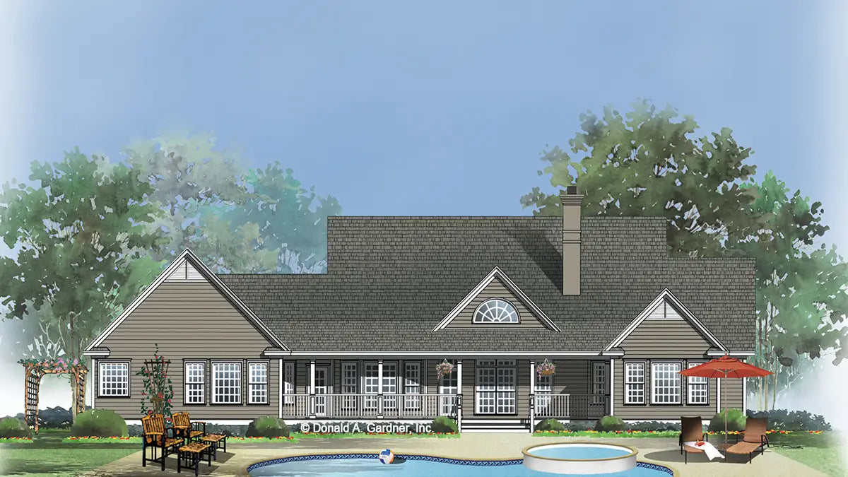 A trio of dormers and a gracious front porch adorn the facade of this sprawling four bedroom country home. Illuminated by the center dormer, the vaulted foyer gives way to a formal dining room with tray ceiling and a spacious great room with cathedral ceiling, fireplace, and built-in shelves. A split bedroom layout provides privacy for homeowners in a generous master suite with tray ceiling, private bath with corner tub, and walk-in closet. Grouped on the opposite side of the home are three additional bedrooms, one with its own bath and walk-in closet. This second master suite is ideal for in-laws, guests, a nanny, or the family teenager.