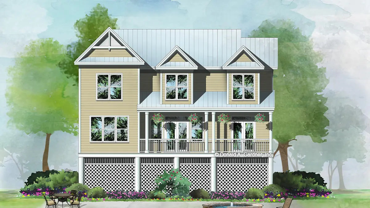 With its elevated pier foundation, this home is well suited to coastal and lakeside locations. Principal rooms are oriented toward the rear of the home for premium waterfront views. On the first floor, a two-story ceiling adds drama and space to the great room two-story ceiling adds drama and space to the great room, which is open to the dining room and kitchen for a large gathering area. The great room, dining room, and study/bedroom all open to the rear porch. Upstairs, a balcony overlooking the great room and foyer joins the master suite and a secondary bedroom and bath. The master suite features a cathedral ceiling, walk-in closet, and its own private bath with separate tub and shower.