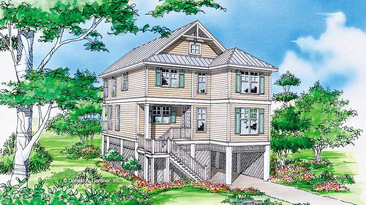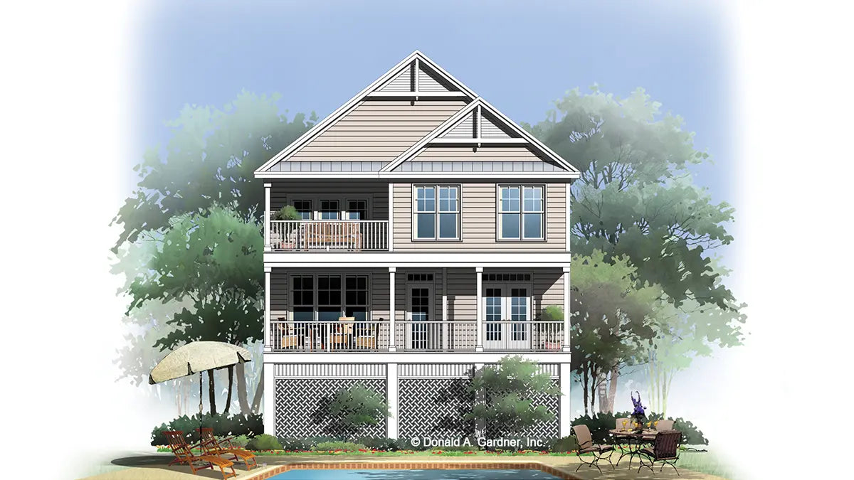This waterfront home features a super slim design for very narrow lots, but plenty of room for family and friends. A two-story ceiling amplifies the open great room with overlooking second floor balcony and clerestory windows. The back porch, dining room, kitchen, and great room flow effortlessly together to create a generous space for socializing and entertaining. The master suite enjoys views from its second-floor porch while pampering homeowners with a large walk-in closet and master bath with his and her vanities separated by a garden tub. The laundry room is conveniently located on the second floor. Two secondary bedrooms and two full baths complete this home's comfortable design.