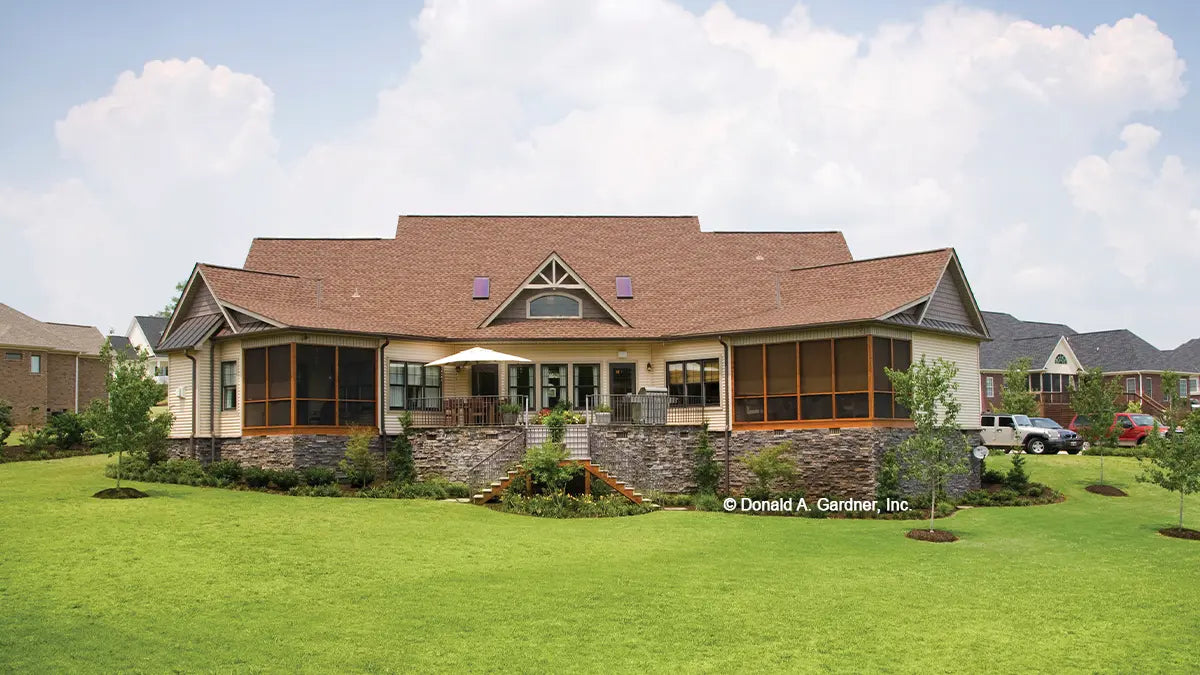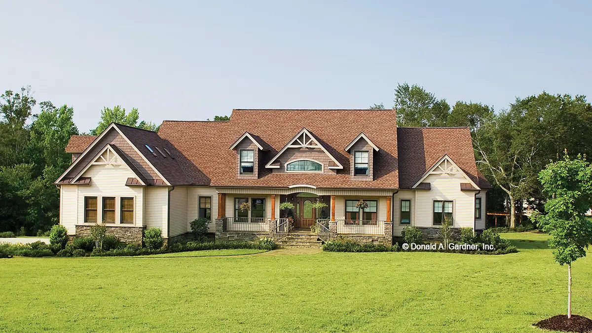 Dormers, gables with wood brackets, a double door entry, and a stone and siding exterior lend charm and sophistication to this Craftsman estate. Cathedral ceilings and fireplaces are standard in the living room, family room, and master bedroom, while the living room, family room, and study feature built-in bookshelves. The spacious kitchen with island stovetop and walk-in pantry opens completely to the family room and breakfast area. The master suite excels with a private sitting room, access to its own porch, two oversized walk-in closets, and a lavish bath. Overlooking both foyer and living room, the second-floor balcony connects two bedrooms, a library, and bonus room.