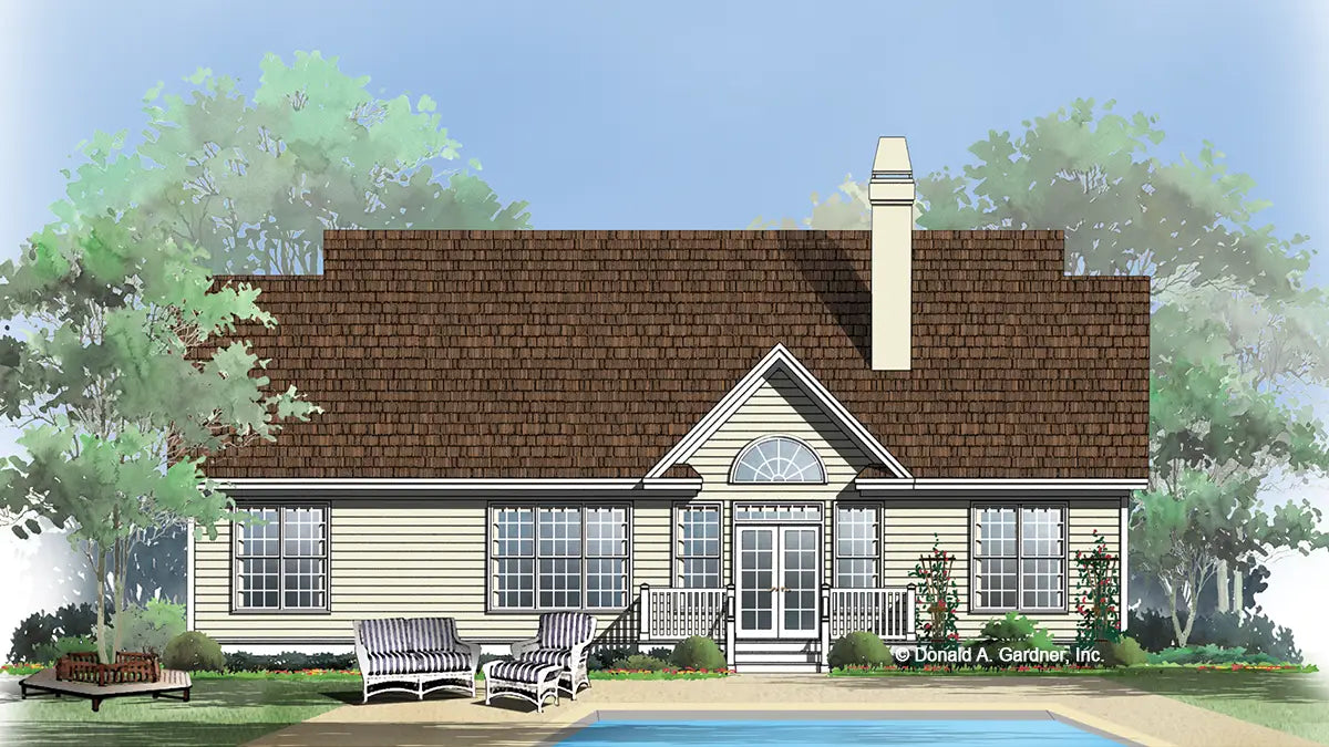 An appealing exterior adds charm and style to this modest sized, economically designed ranch home. A shared cathedral ceiling enlarges the great room and dining room, adding spaciousness without square footage for homebuyers on a budget. A rear clerestory dormer, cozy fireplace, and built-ins enhance the great room, while the kitchen features an efficient design with breakfast/serving counter. A refined tray ceiling tops the master bedroom with walk-in closet and bath. Two secondary bedrooms and a full bath are located on the opposite side of the home affording privacy for homeowners.
