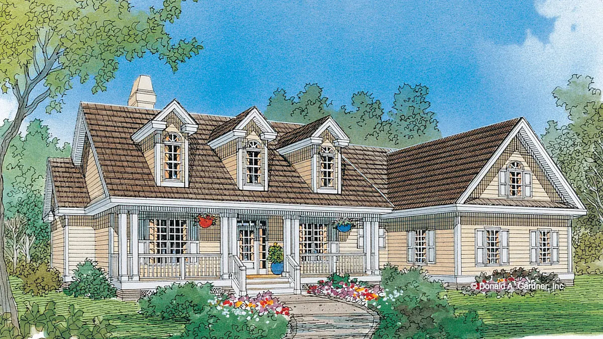 A trio of dormers with arch-topped windows and a country front porch adorn the facade of this gracious, three-bedroom home. Columns and a tray ceiling grant distinction and definition to the formal dining room, while the great room is enriched by a cathedral ceiling with two rear clerestory dormers, a fireplace, and built-in bookshelves. The home's split bedroom design provides plenty of privacy for the master suite, which features a tray ceiling, walk-in closet, and bath. Two secondary bedrooms, one with back porch access, share a hall bath with linen closet.