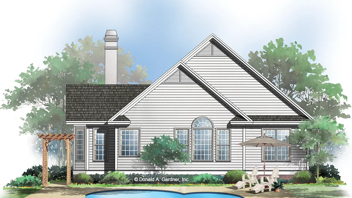 Multiple gables, an arched picture window, and an L-shaped front porch add size and style to this charming cottage. An open floor plan open floor plan enhances spaciousness in the common areas of this compact home, where a vaulted ceiling in the great room and a bay window and tray ceiling in the dining room create volume and elegance. A pass-thru from the kitchen to the great room adds to the plan's openness. The master bedroom boasts a cathedral ceiling and a trio of windows. The master bath features a dual sink vanity and a separate tub and shower. Two family bedrooms, one with a walk-in closet, share a hall bath.