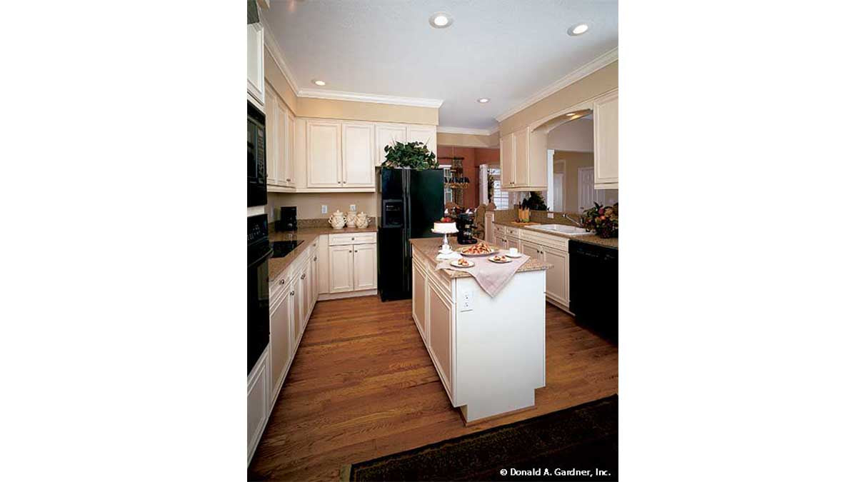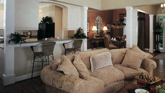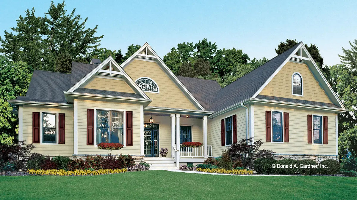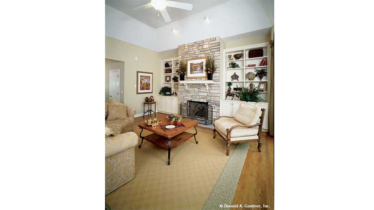 This striking ranch home plan combines stone, siding and cedar shake to create instant curb appeal. The interior features an open floor plan with high ceilings, columns, and bay windows to visually expand space. Built-in cabinetry and a kitchen pass-thru add convenience, and a secondary bedroom could be used as a guest suite.