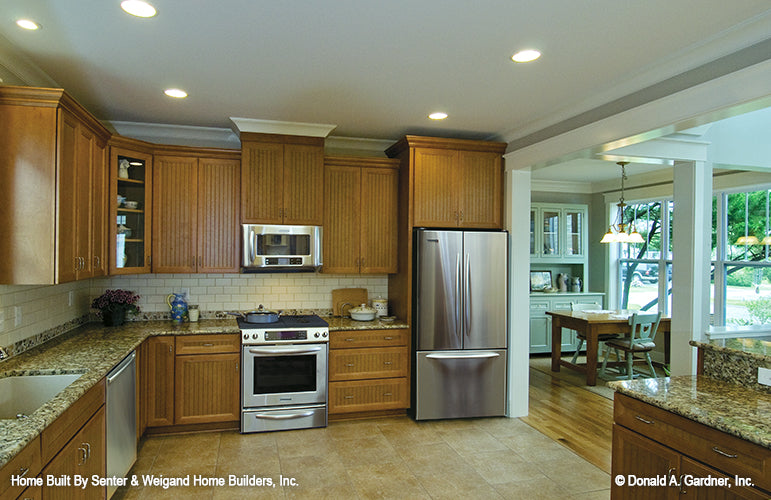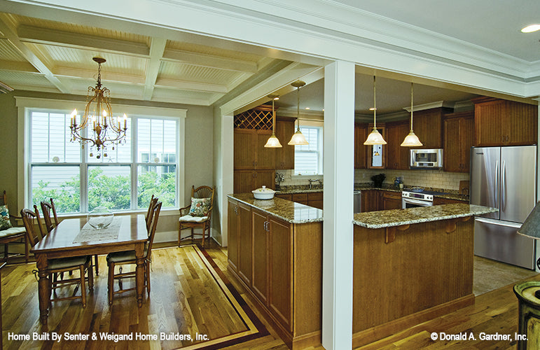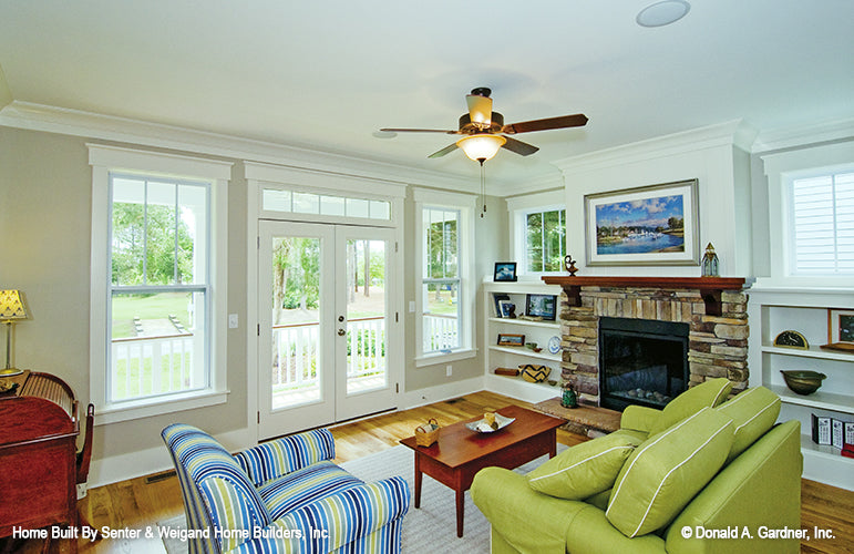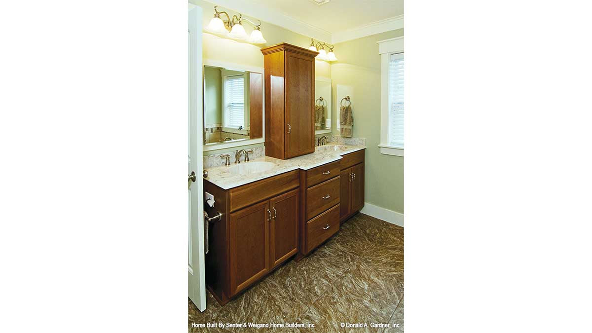 This narrow lot home plan has a surprisingly stylish facade with first and second level porches, multiple gables and arched windows. The home features a formal living room with fireplace as well as a family room with two-story ceiling. This house plan's kitchen is spacious and efficient, conveniently positioned to service the dining room, breakfast room and family room with equal ease. Upstairs in this home plan, the hall doubles as a balcony that overlooks the family room. The master suite is a treat with its tray ceiling, private porch, his and her walk-in closets and splendid bath. Two family bedrooms share access to a segmented bath with a dual sink vanity.