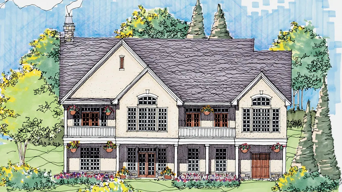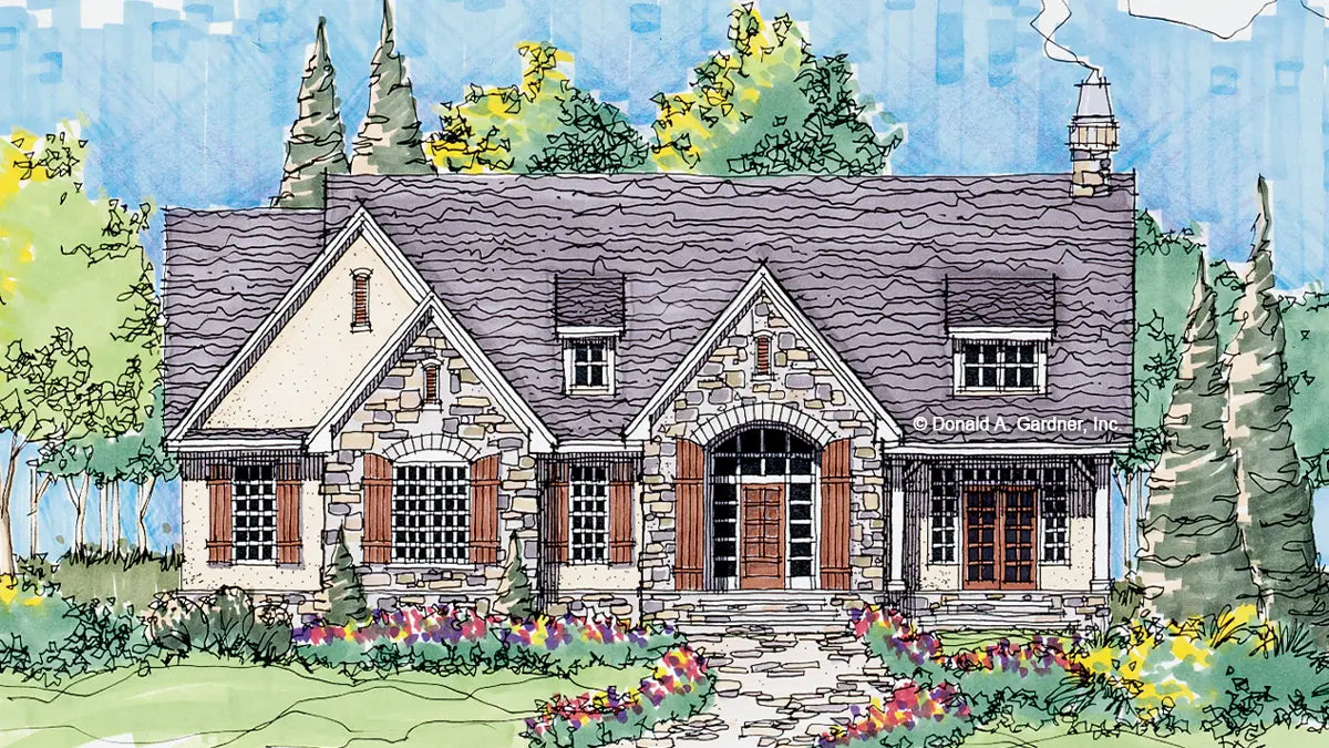 An arched and gabled entry, craftsman details, and a mixture of stone and stucco create an interesting and appealing facade for this hillside walkout home. The great room with cathedral ceiling is flanked by front and back porches, while two back porches similarly border the dining room with tray ceiling and arch-topped picture window. The master suite is spacious and also features a tray ceiling and arch-topped picture window as well as back porch access, a walk-in closet, and private bath. Downstairs, the walkout basement includes two bedrooms, storage, and a recreation room that accesses a rear patio that spans the width of the home.