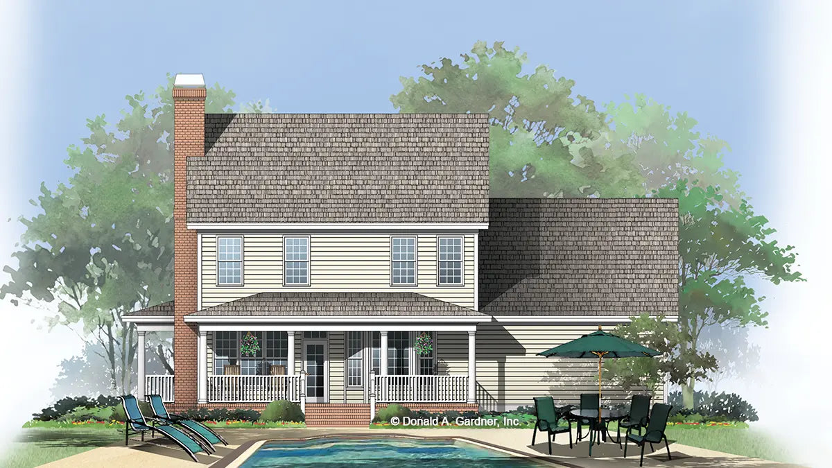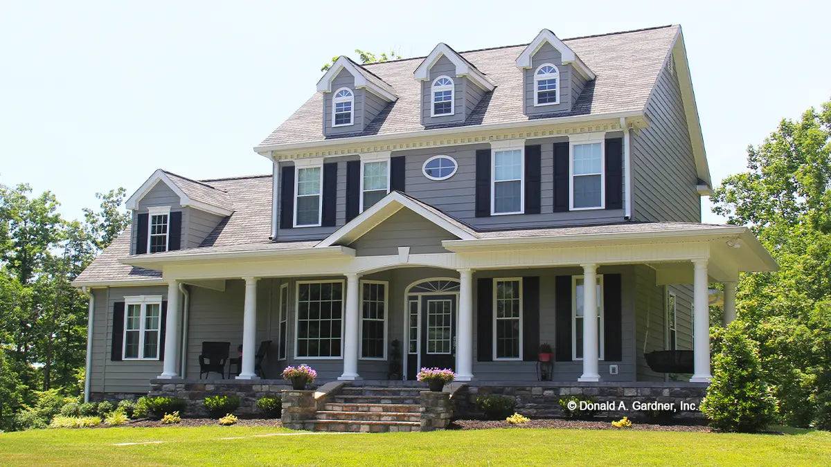 A trio of dormers with arch-topped windows, a splendid oval window, and a wrapping front porch with gable entry create a genteel facade for this modest and affordable farmhouse. The great room is generously proportioned and open to the kitchen and breakfast area with delightful bay window. Another bay window expands the dining room, and front and back porches provide ample outdoor living space. The master suite is located on the second floor with two family bedrooms and a sizable bonus room. A tray ceiling tops the master bedroom, which features a walk-in closet and private bath. Note the large storage room in the garage.