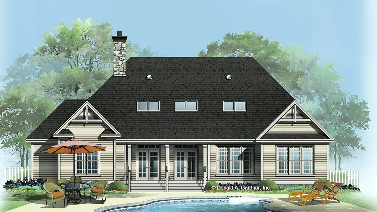 One-story house plan with an elegant stone and shake exterior