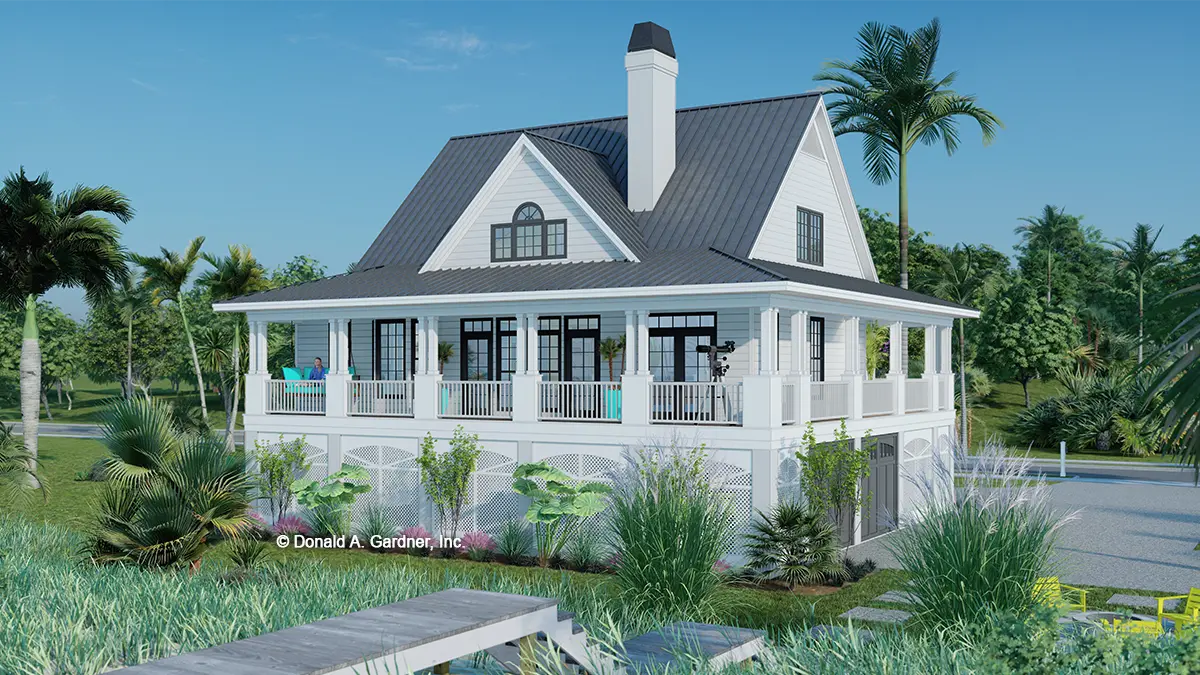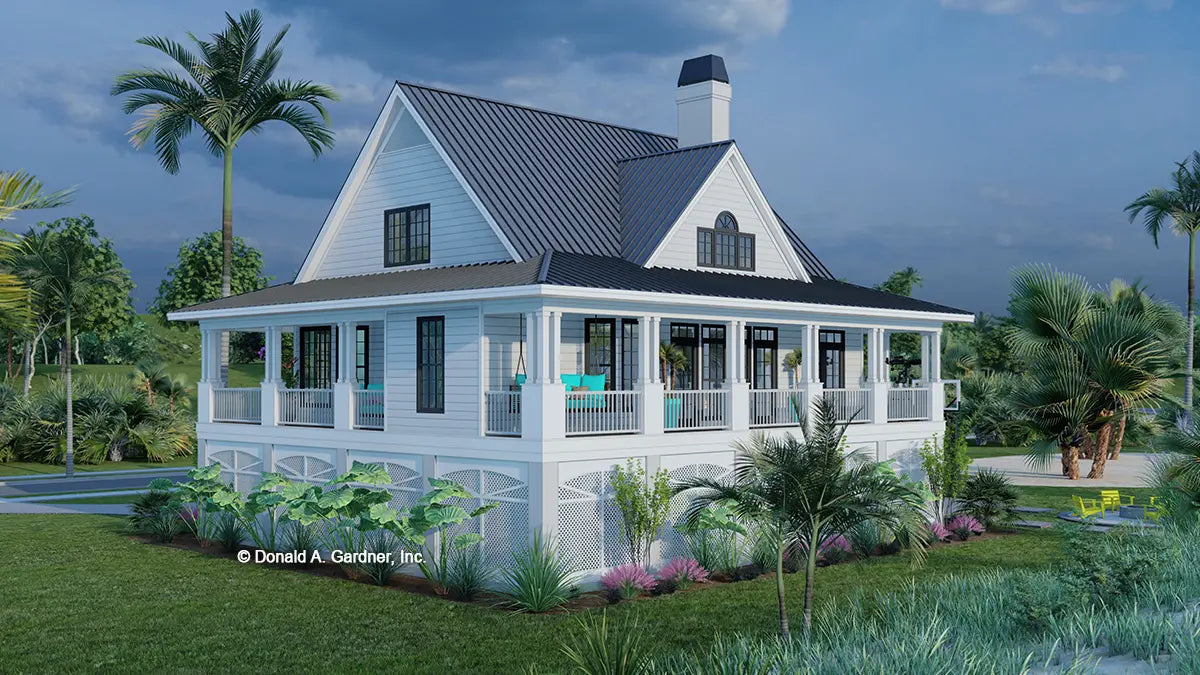 A charming trio of dormers with arch-topped windows creates curb appeal, while an irresistible wraparound porch surrounds this Low Country classic home with grace and comfort. The foyer is vaulted and illuminated by the center dormer above. A stunning cathedral ceiling is highlighted by a rear clerestory dormer in the great room. Bay windows add light, space and appeal to the dining room and breakfast area. The first floor master suite enjoys French door access to the wraparound porch, a walk-in closet, and private bath with dual vanities, garden tub, and spacious shower. The second floor hall overlooks the great room and connects two more bedrooms and a bath.