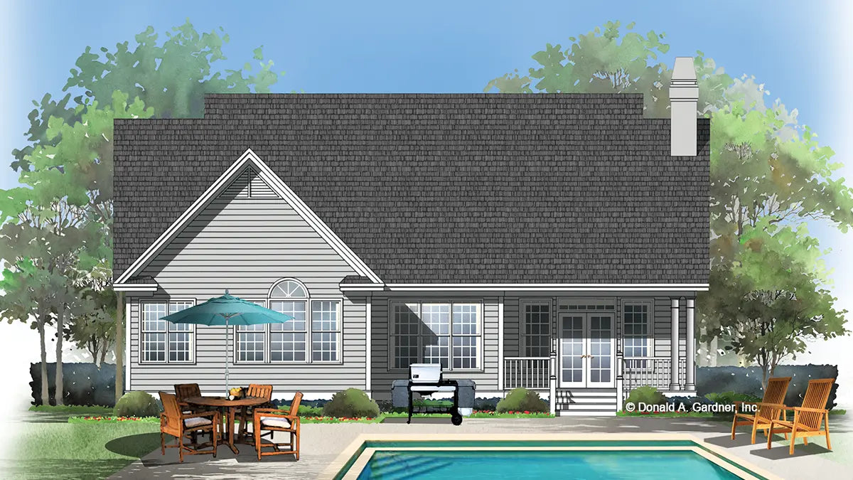 With a front-entry garage and an efficient footprint, this 4-bedroom family home fits perfectly on a narrow neighborhood lot. This kitchen keeps the chef in the center of activities. Surrounding the kitchen is the sunny breakfast area, the great room with fireplace, and a dining room distinguished by columns, along with a tray ceiling. Soaring cathedral ceilings heighten the master bedroom and great room, while porches welcome outdoor relaxation.