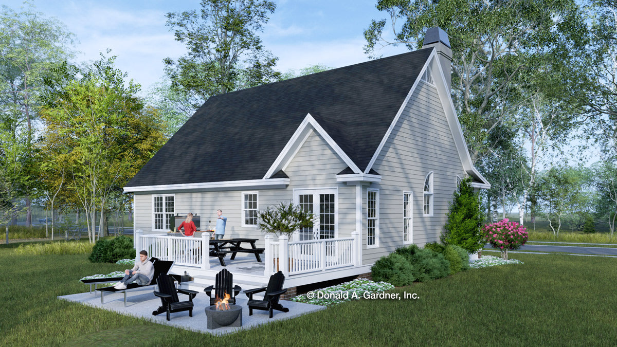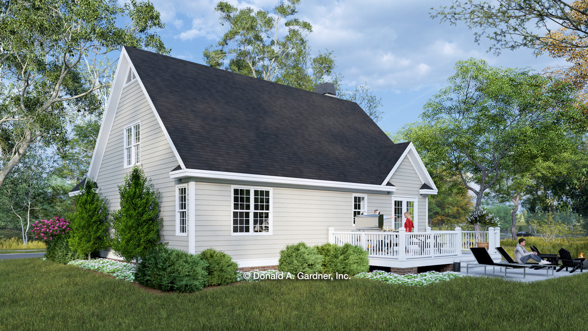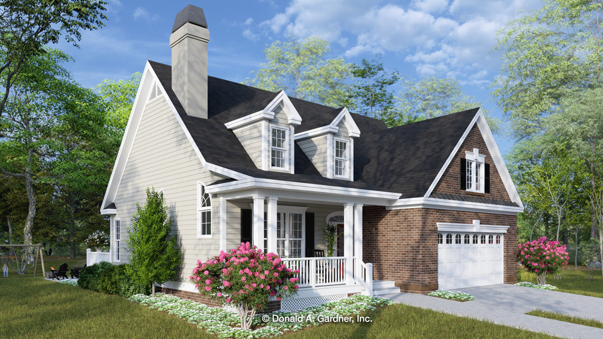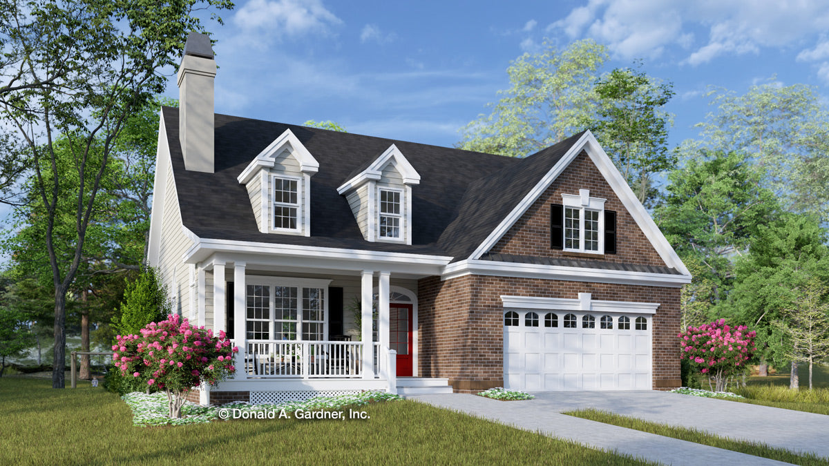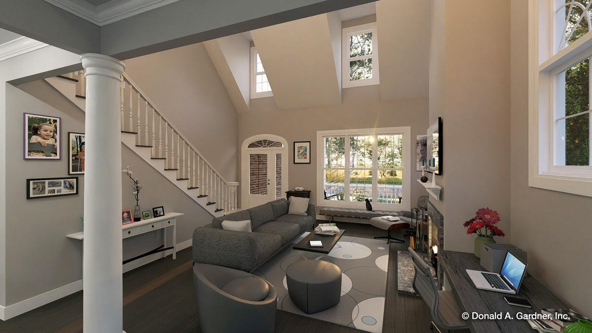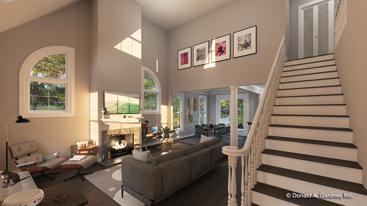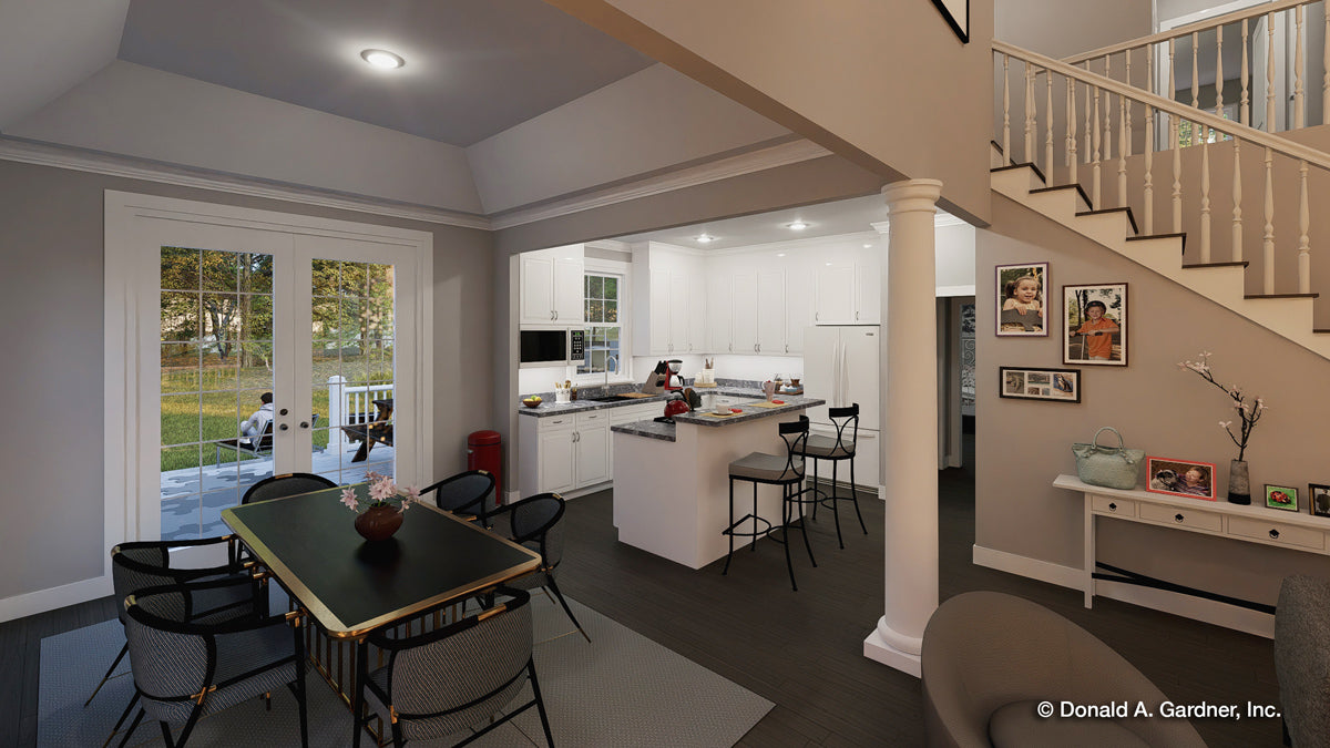 A two-story cathedral ceiling, twin dormers, and an open floor plan expand space and make full use of natural lighting in this cozy, two-story cottage house plan. The dining room is distinguished from the kitchen by a single column and tray ceiling. Placing the counters against the walls allow for plenty of workspace, while keeping the kitchen uncluttered.