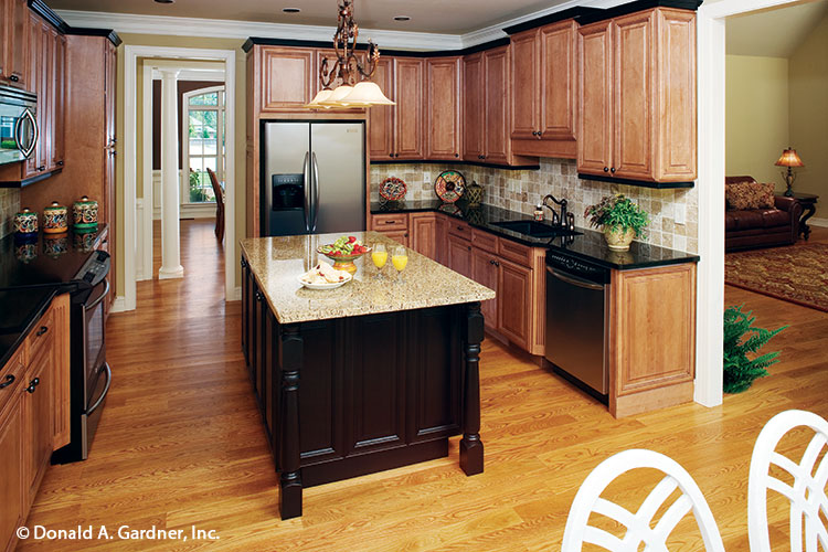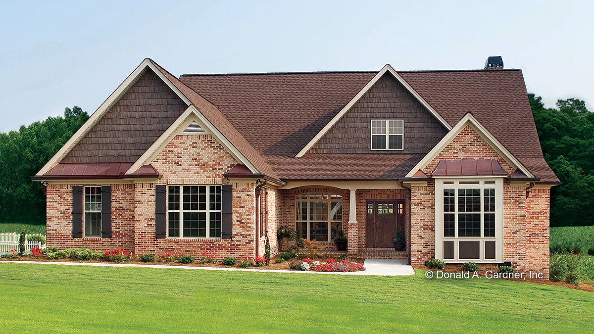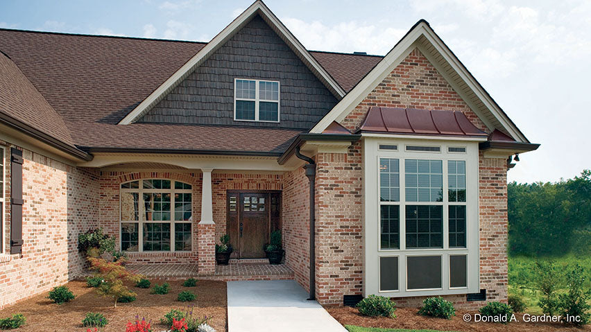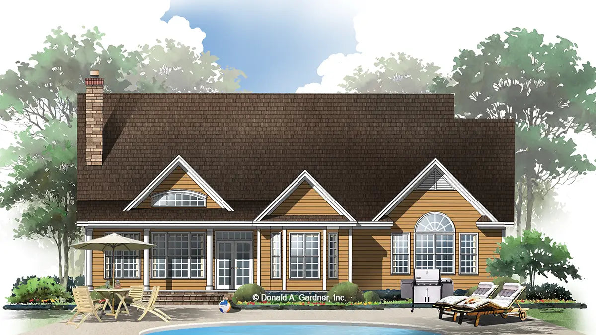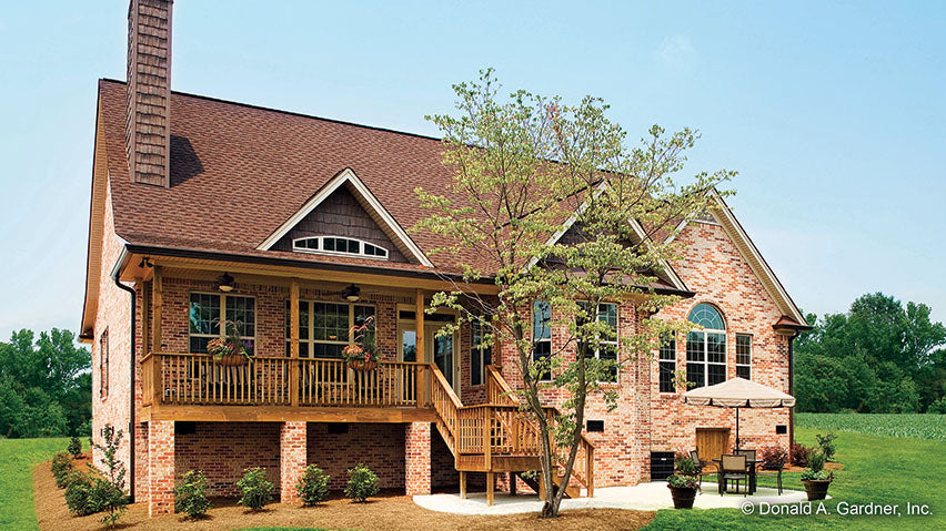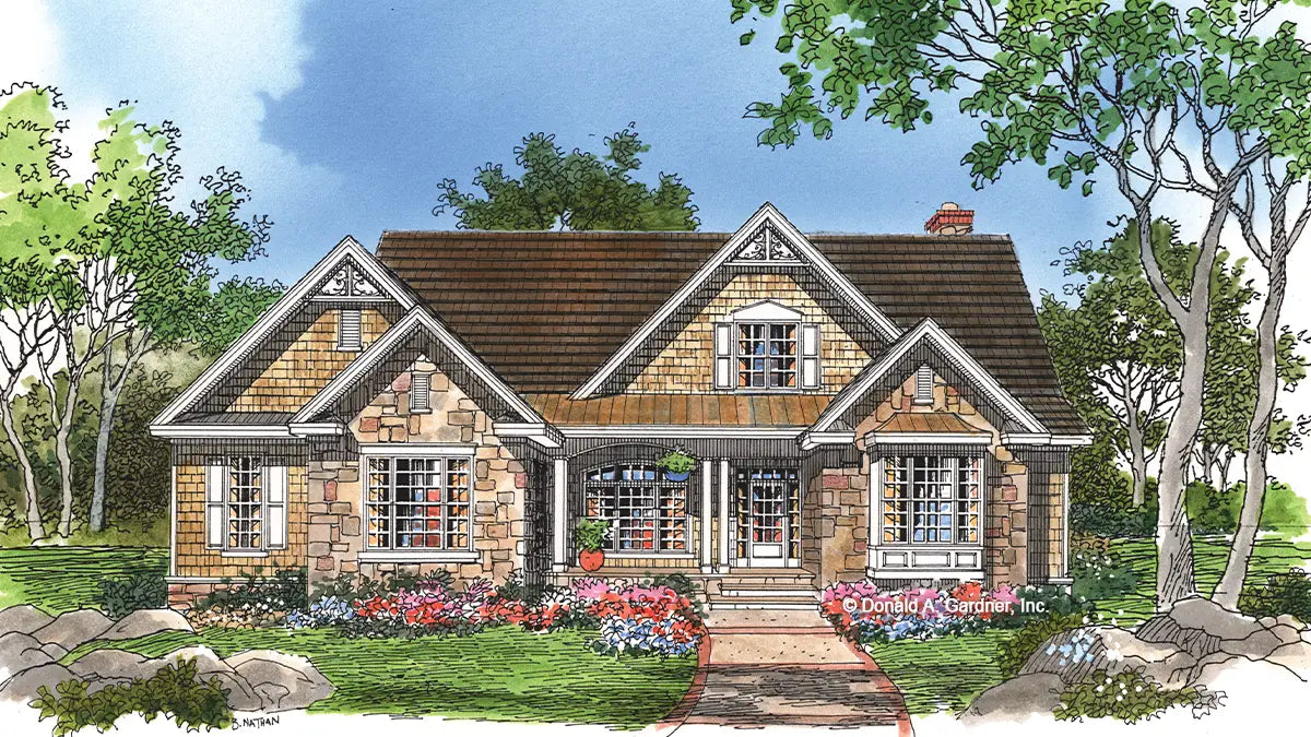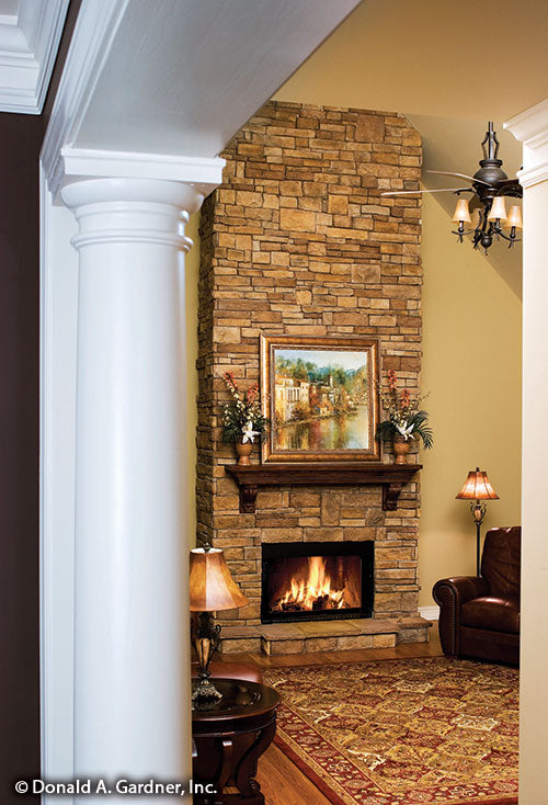 From metal and shingles to cedar shake and stone, this rustic home plan blends with a variety of settings and adds timelessness to any lot or streetscape. Greeting with columns, sidelights, and a transom, the front entry leads to an open interior. Columns and decorative ceilings define common rooms without enclosing space in this home plan.