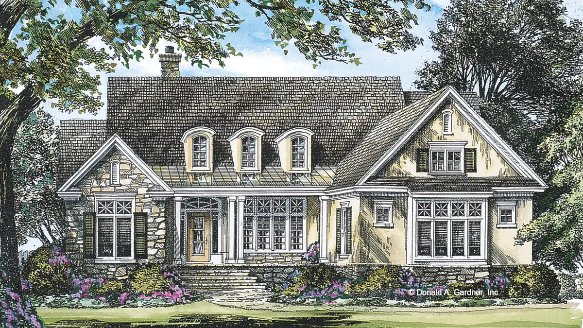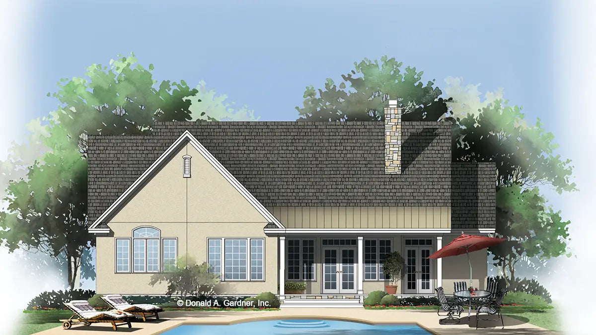 This simple house plan features a welcoming country facade and a modest floor plan. Tray ceilings heighten the dining room and great room. A convenient kitchen pass-thru connects to the great room, and French doors in the great room and breakfast area access the rear porch. An arch in the master bedroom's tray ceiling frames a window, while a full bath separates additional bedrooms.