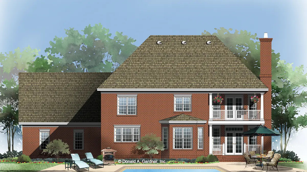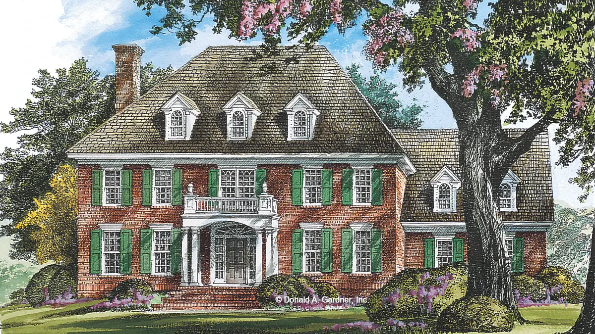 This two-story house plan features an elegant brick exterior. Accented with heavy crown molding, two groups of dormers, and an exquisite balustrade on the outside, a striking staircase directs the traffic into different areas inside, such as: the great room with fireplace, the open dining room, to the kitchen with its versatile island, or upstairs to the second-floor bedrooms.