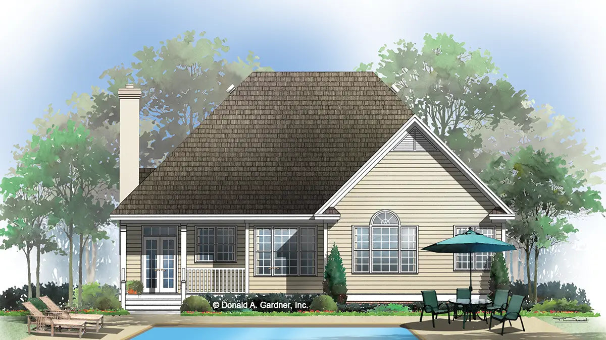 This striking narrow lot house plan features an arched entrance, nostalgic front porch, and hip roof. With a fireplace and built-in cabinetry, the great room accesses the side porch and the dining room. The dining room includes columns, a tray ceiling, and French doors that also lead to the side porch. Above the garage a bonus room awaits expansion needs.