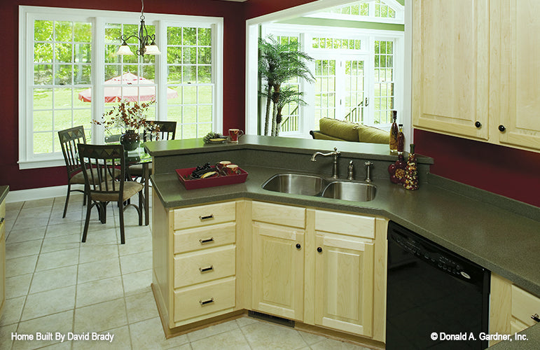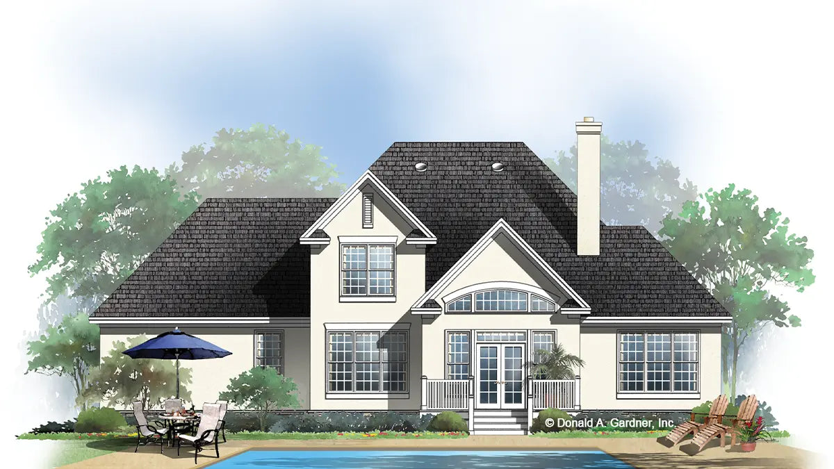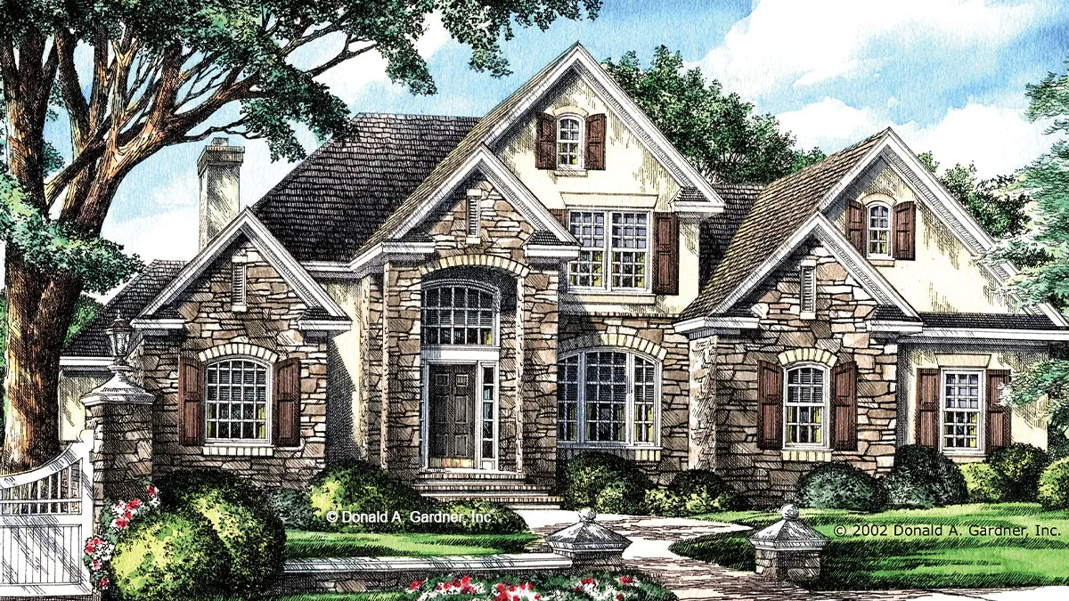 Incorporating European style, this house plan combines stone and stucco with gables and arched windows for a stunning facade. The grand portico leads to an impressive, open floorplan. Built-in cabinetry, French doors, and a fireplace enhance the great room, while an angled counter separates the kitchen from the breakfast nook of this house plan.